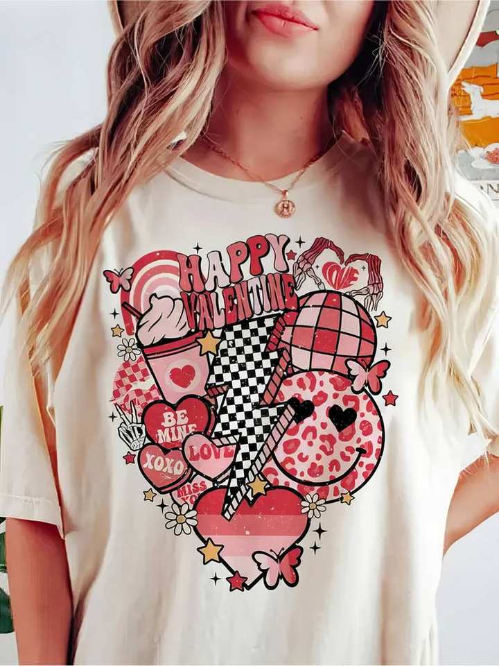 Valentine's Day Women's Printed T-Shirt Short Sleeve Round Neck Heart Star Plaid Pattern Casual Spring Summer Top
