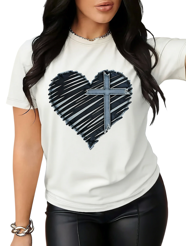 Valentine's Day Women's Short Sleeve T-Shirt Cross Heart Print Crew Neck Casual Top 100% Cotton Breathable Lightweight