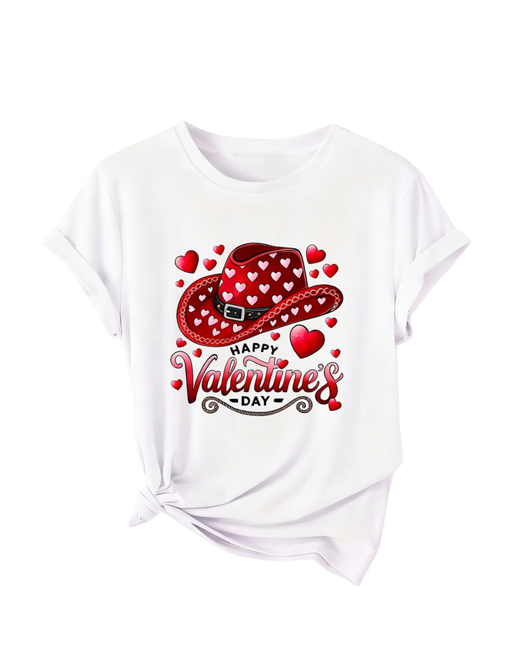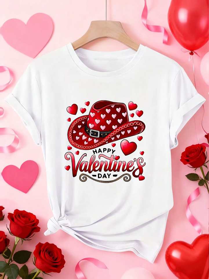 Valentine's Day Women's Short Sleeve Western Print T-Shirt Heart Cowboy Hat Round Neck Cotton Casual Top Spring Summer Autumn