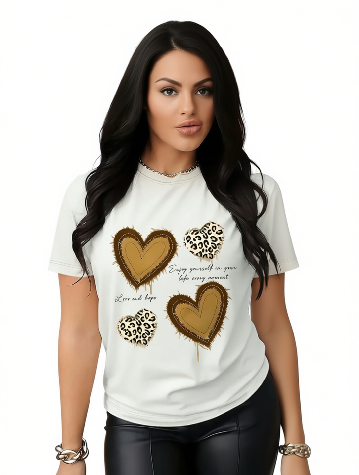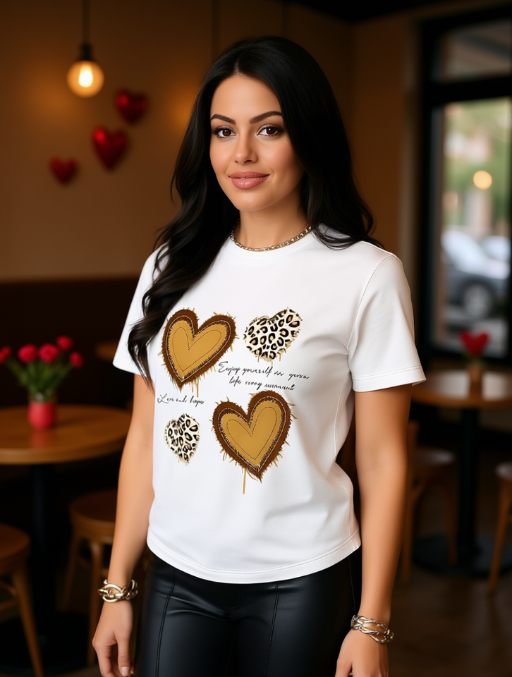 Valentine's Day Women's Short Sleeve T-Shirt Leopard Print Heart Design Round Neck Casual Top Breathable Lightweight Cotton