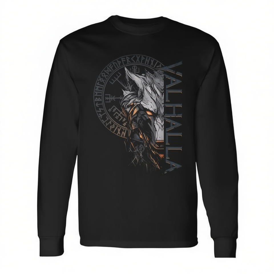 T-shirt a maniche lunghe Valhalla Wolf Viking con design a bussola con rune nordiche
