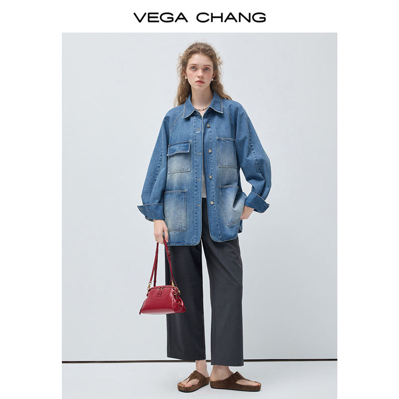 Vega Chang Giacca Casual Mini in Denim Americano Retrò, Blu Brillante con Sciarpa a Pois, Stile Unico e Sofisticato per il Pendolarismo, Design Non Ripetitivo