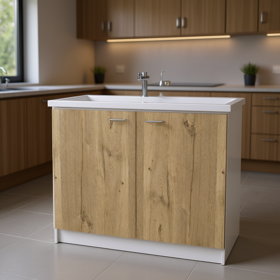 Mobile da Cucina con Lavello Bianco in Rovere Chiaro, Design Moderno, Mobile da Cucina Rettangolare con Lavello