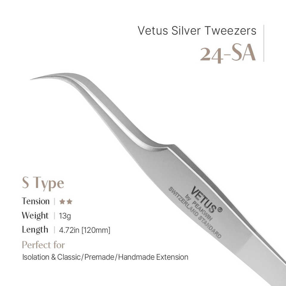 Pinzette Vetus 24-SA in Acciaio Inox Argento, Forma a S Curvata, Pinzette di Precisione per Ciglia ad Alto Volume