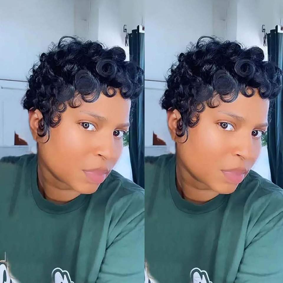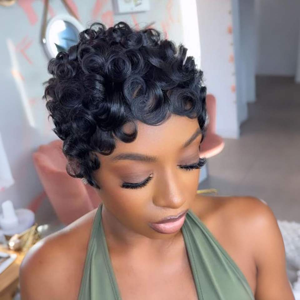 Parrucche Corte Pixie in Capelli Umani Vietnamiti per Donne di Colore, Senza Colla, Pre-Sfoltite, Ricci Morbidi con Frangia, Nero Naturale