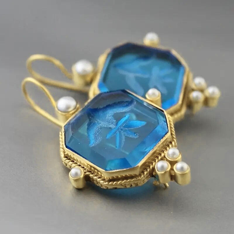 Vintage 18K Solid Gold Drop Earrings With Freshwater Pearl Bezel Setting Geometric Shape For Women Everyday Wear