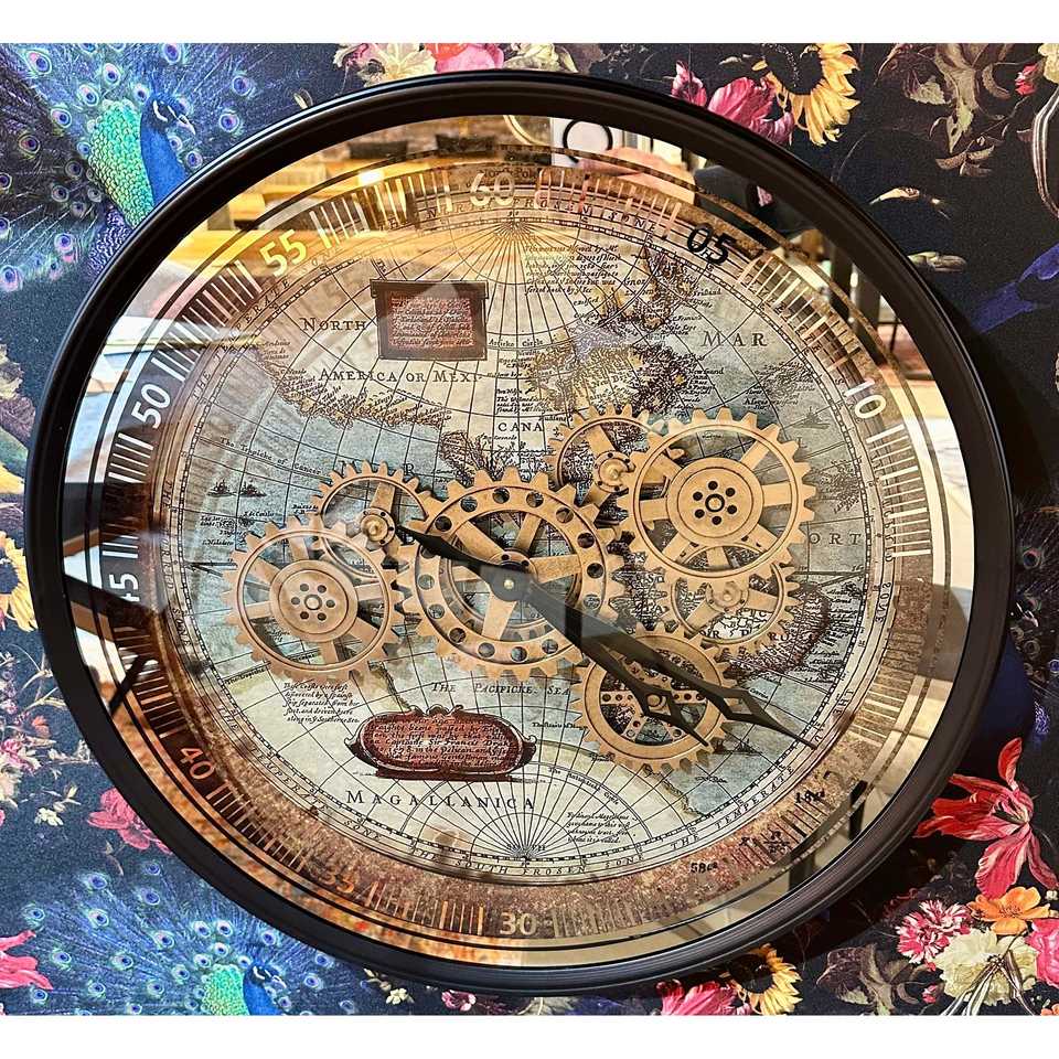 Orologio da parete vintage mappa 60 cm rotondo nero cromo ingranaggio animato