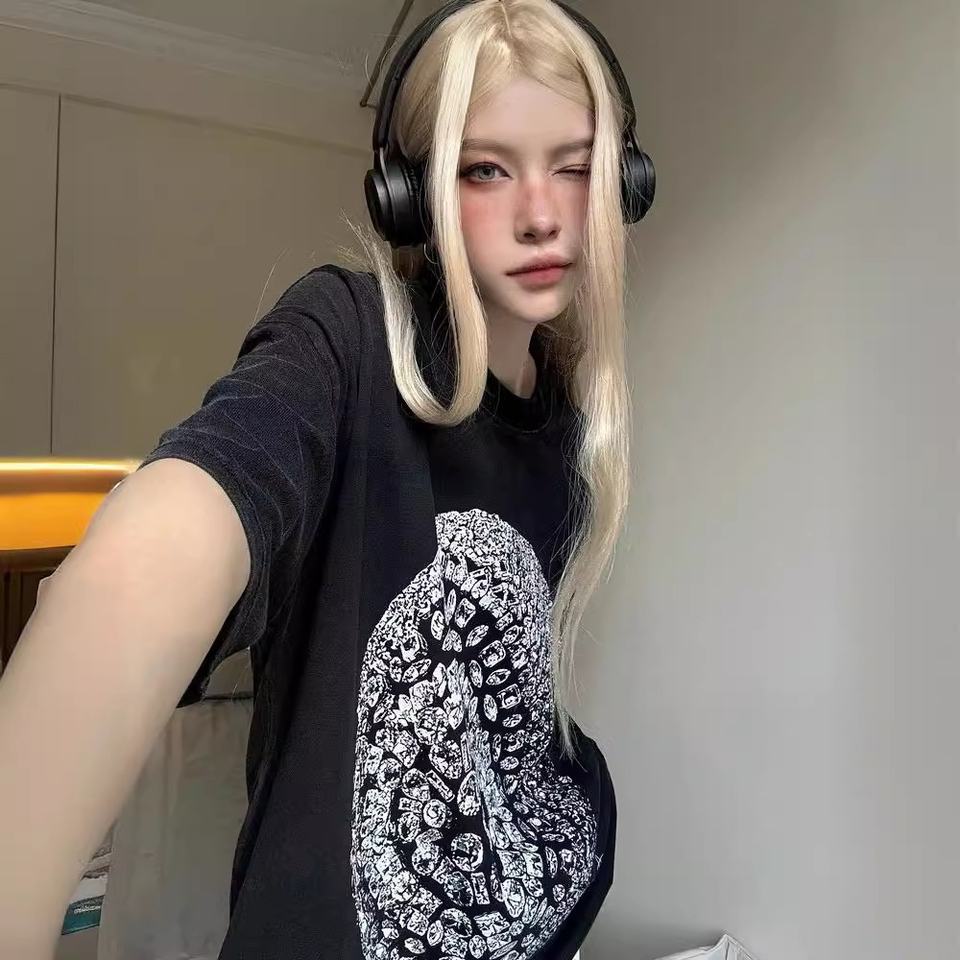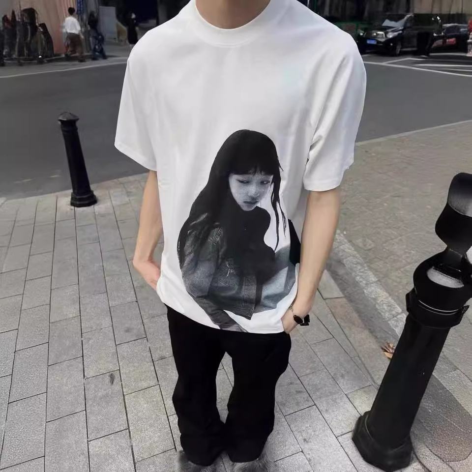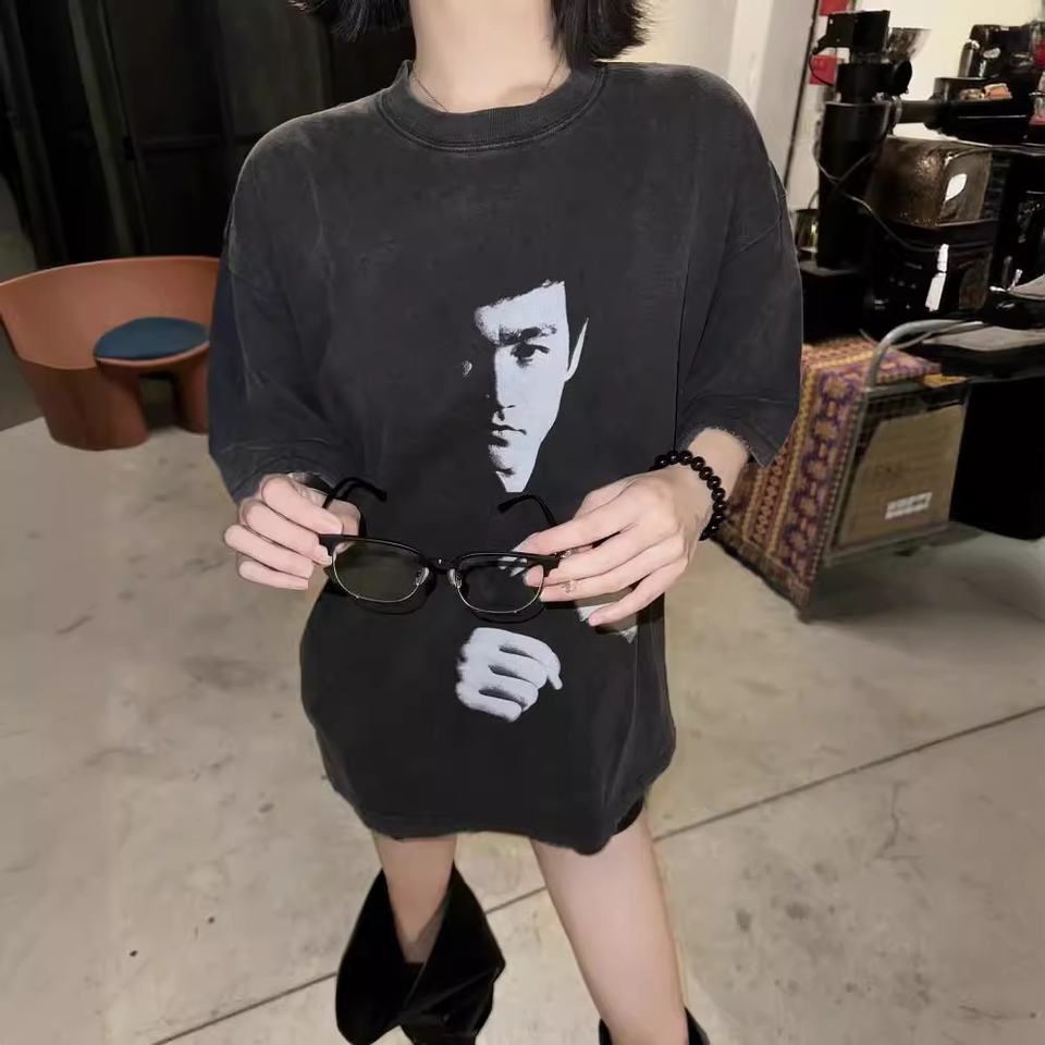 T-shirt Vintage Americana con Stampa Caratteristica, in Cotone Pettinato, Lavaggio Pesante Effetto Usurato, Vestibilità Ampia, a Maniche Corte, per Coppie, di Tendenza