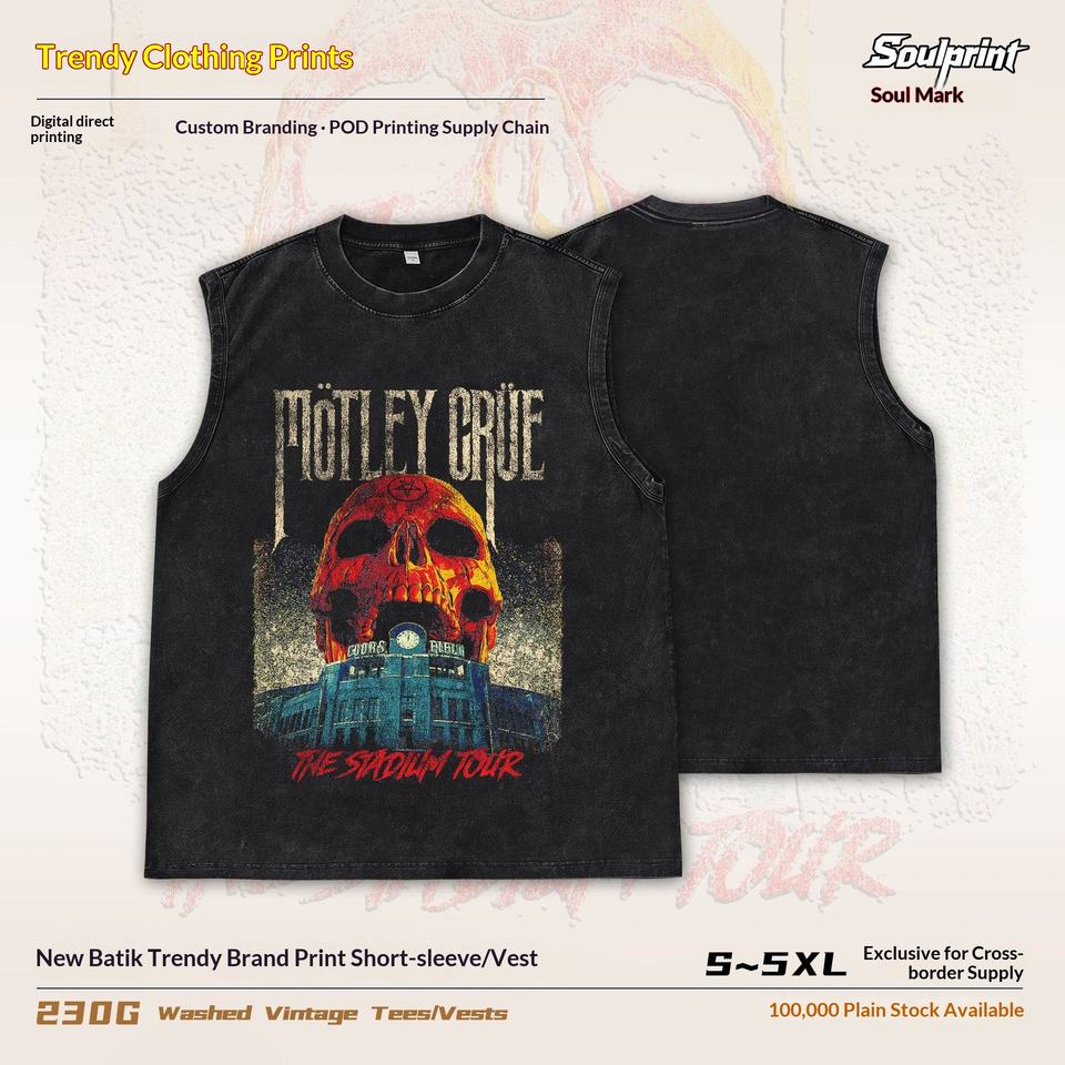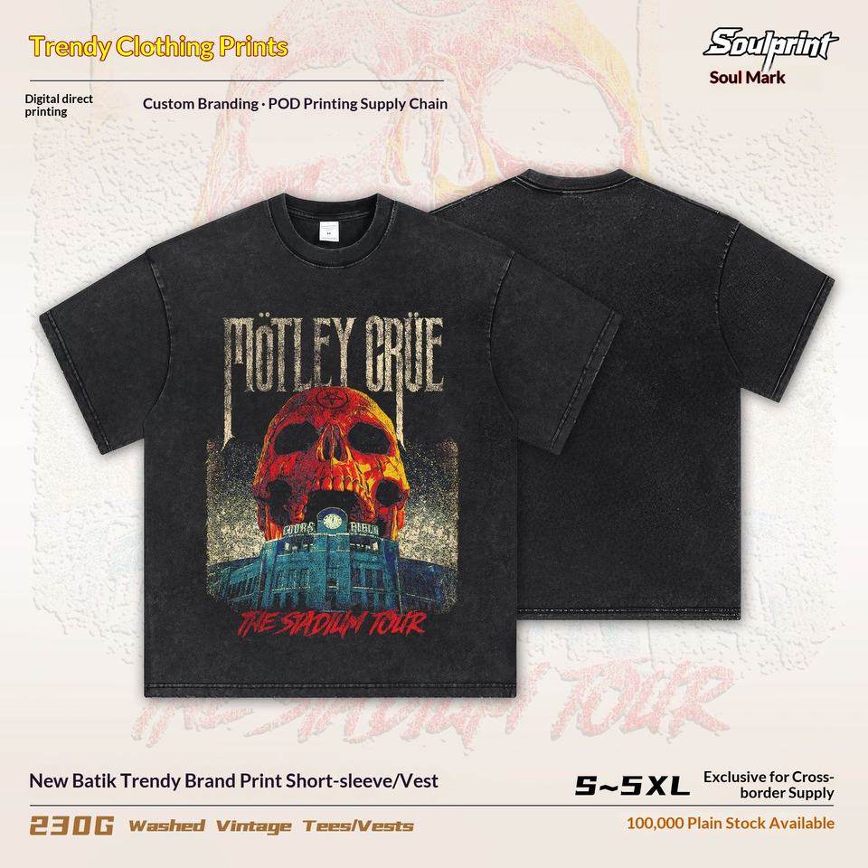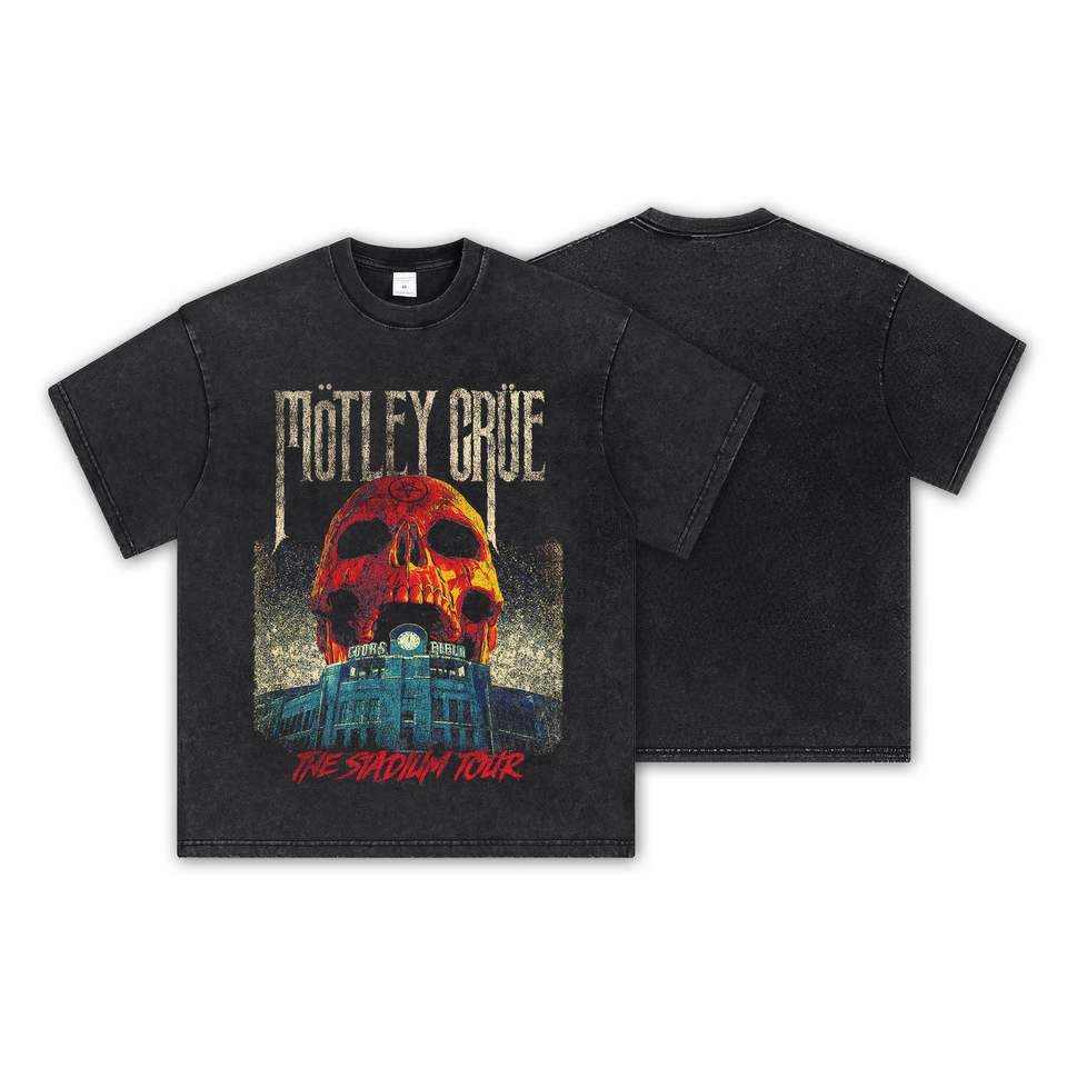 T-shirt Vintage Americana Retrò in Cotone Lavato e Invecchiato, Stampa Motley Crue, Manica Corta, Vestibilità Ampia, Stampa Digitale Diretta