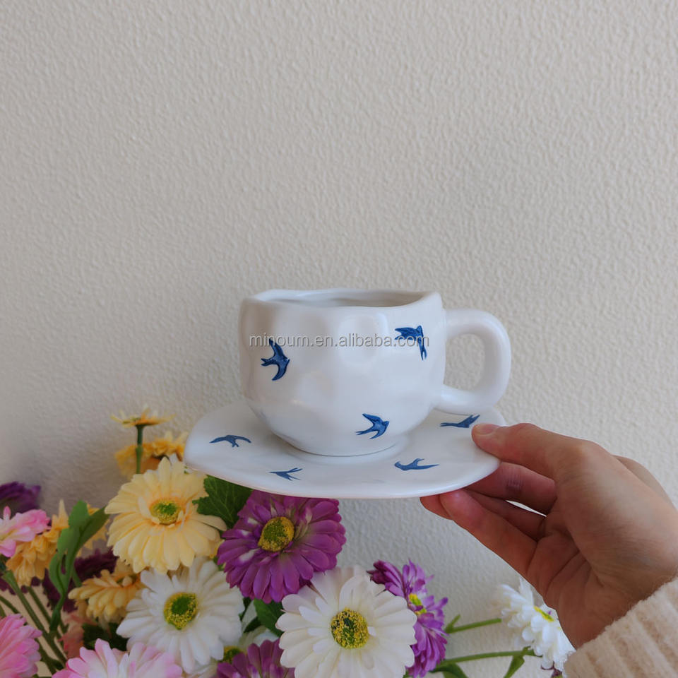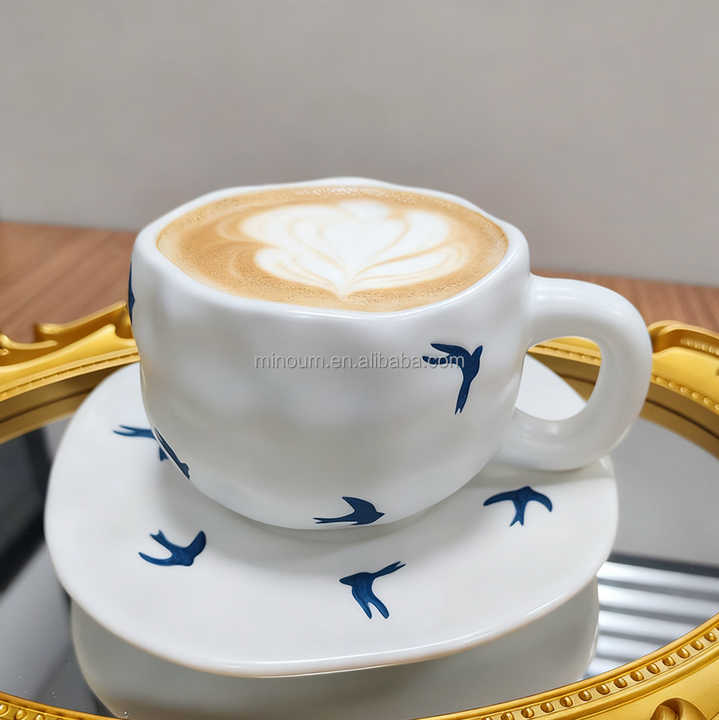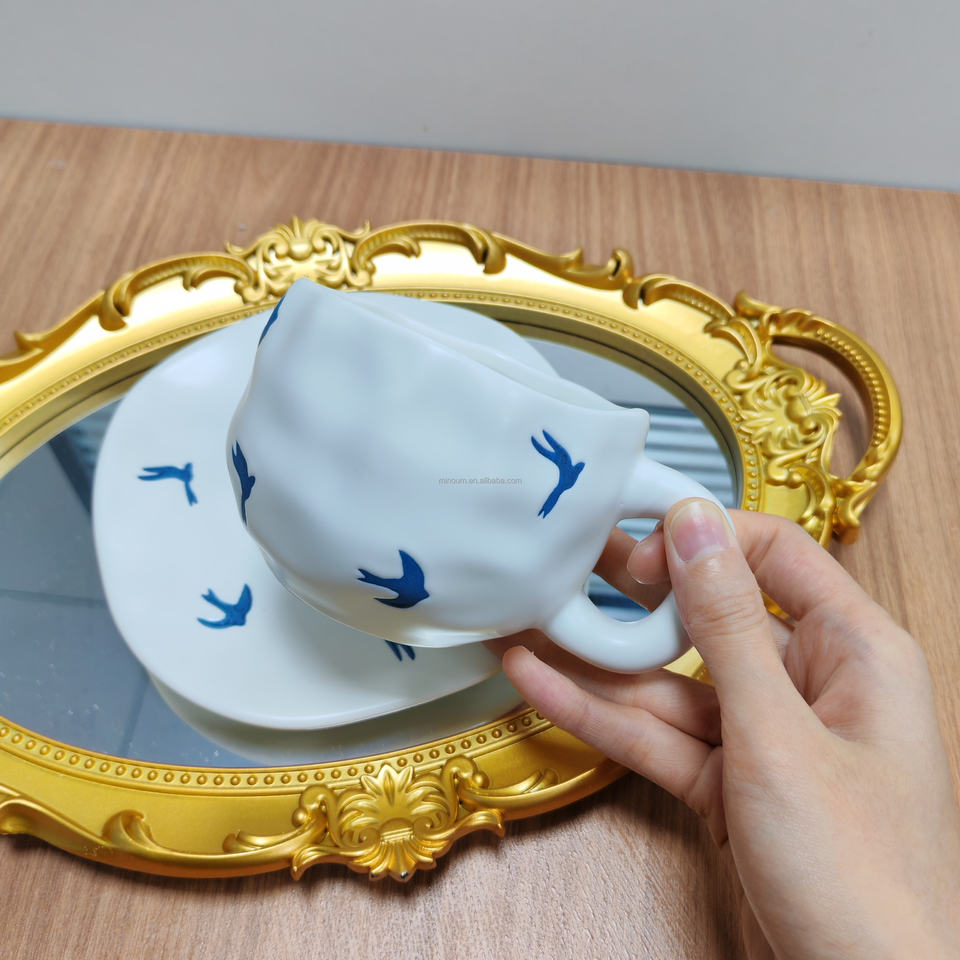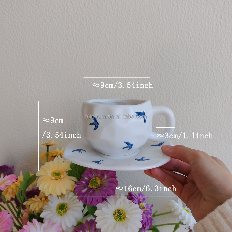 Set Vintage di Tazza da Caffè in Porcellana con Motivo Blu Classico e Vassoio, 300ml, Adatto al Microonde, Regalo Aziendale