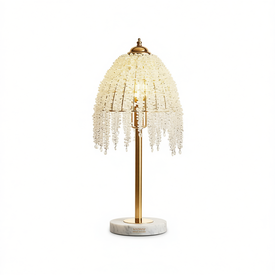 Lampada da Tavolo Vintage con Perline di Cristallo, Base in Ferro Dorato da 19 Pollici, Paralume a Cupola in Marmo, Illuminazione per Soggiorno