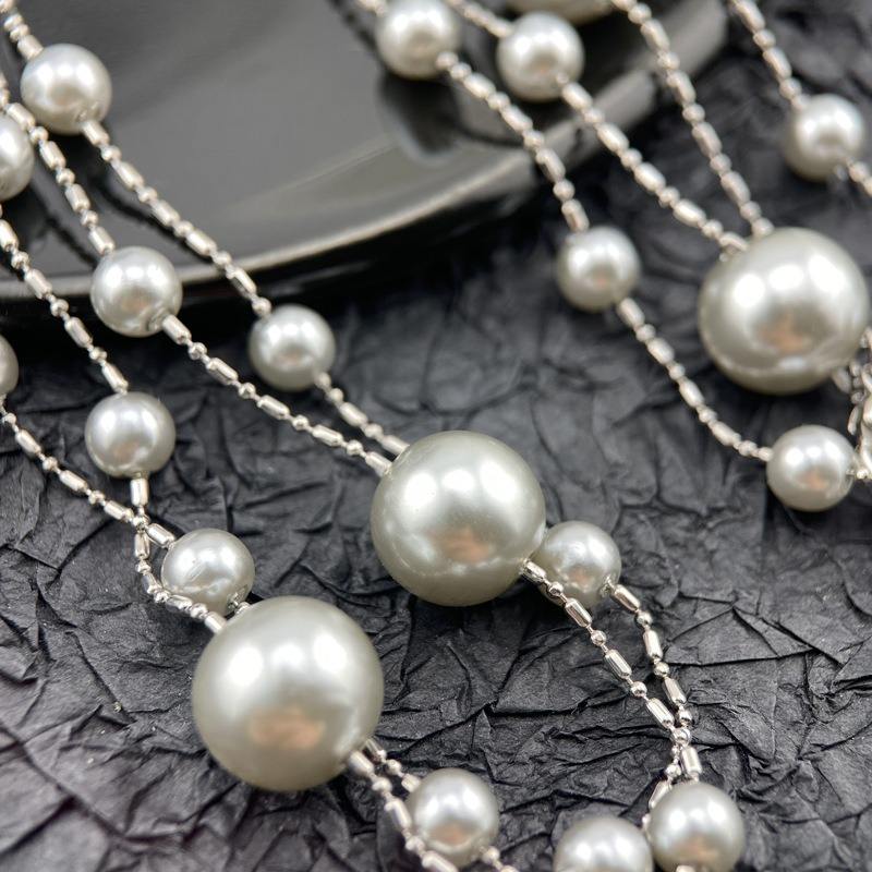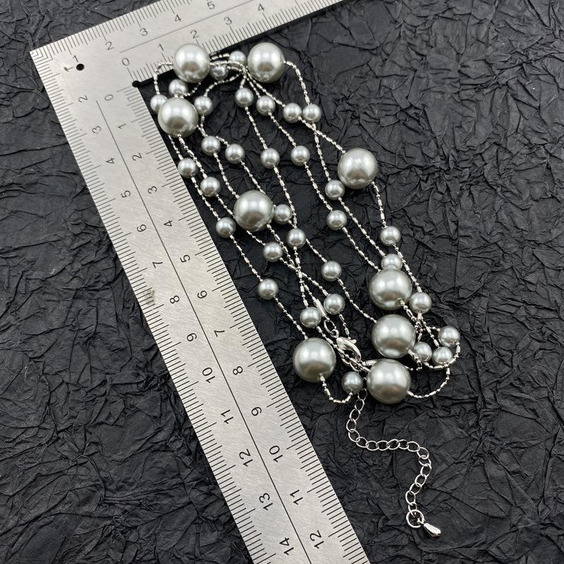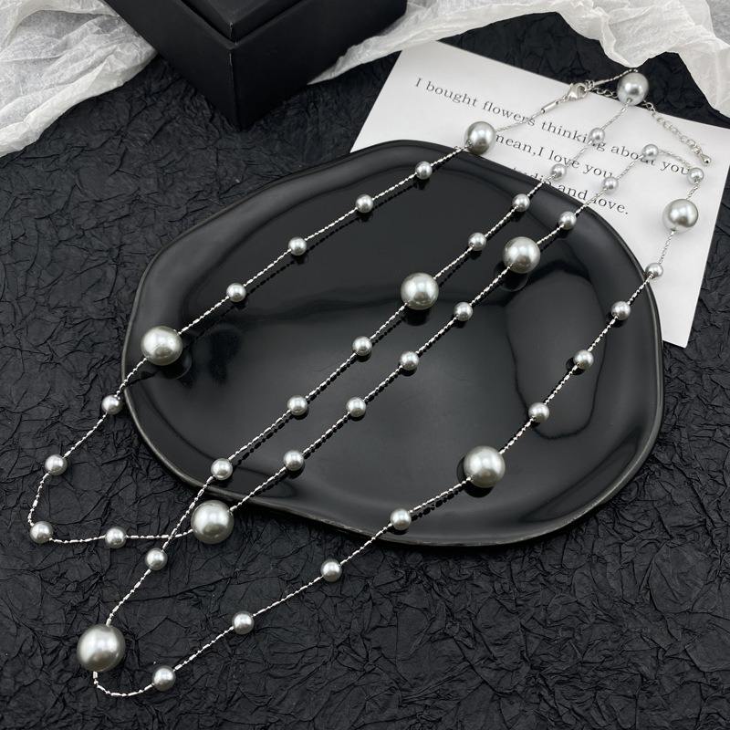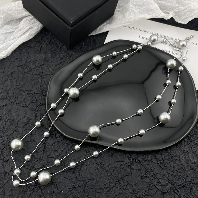 Vintage Designer Trendy Fashion Multilayer Brass Imitation Pearl Long Gray Sweater Necklace for Women Wedding Party