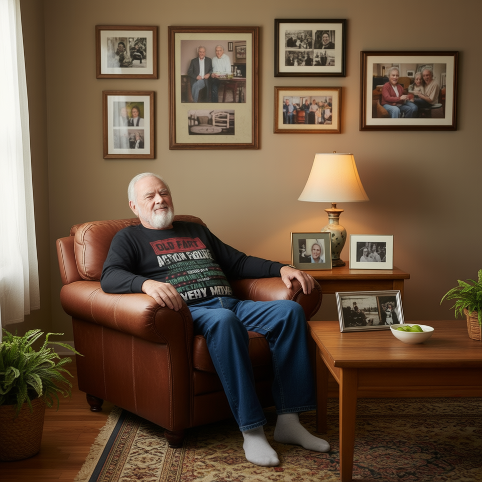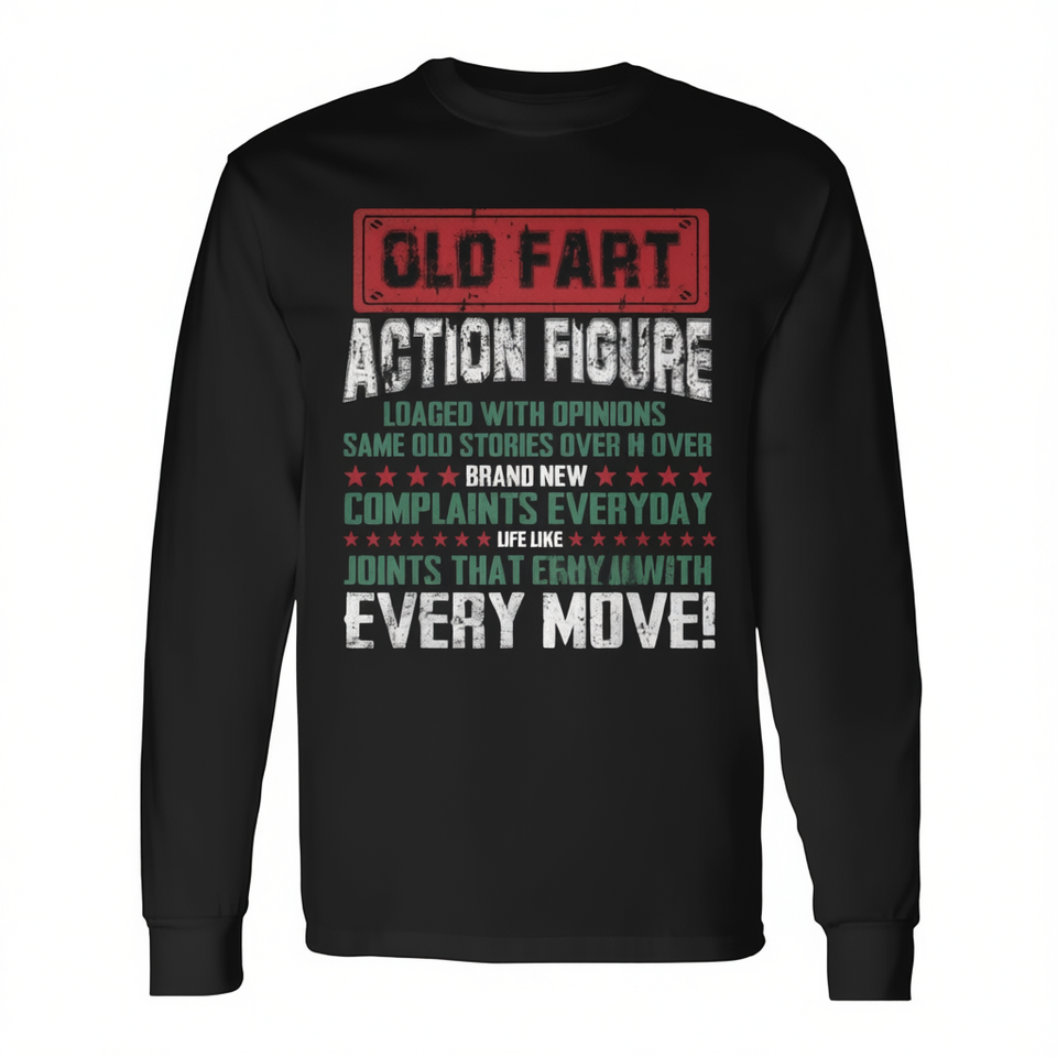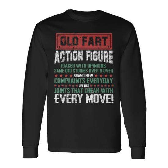 T-shirt vintage a maniche lunghe effetto invecchiato per pensionati, abbigliamento promozionale con stampa Old Fart Action Figure