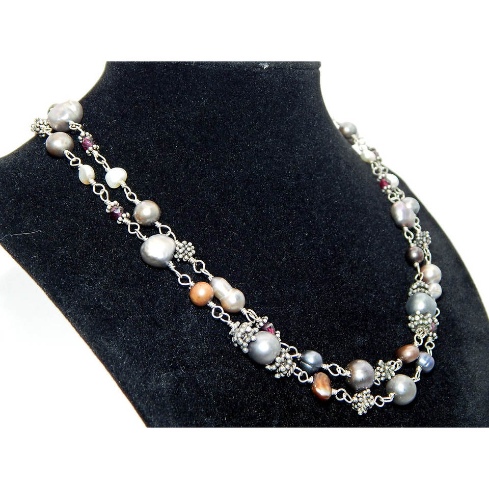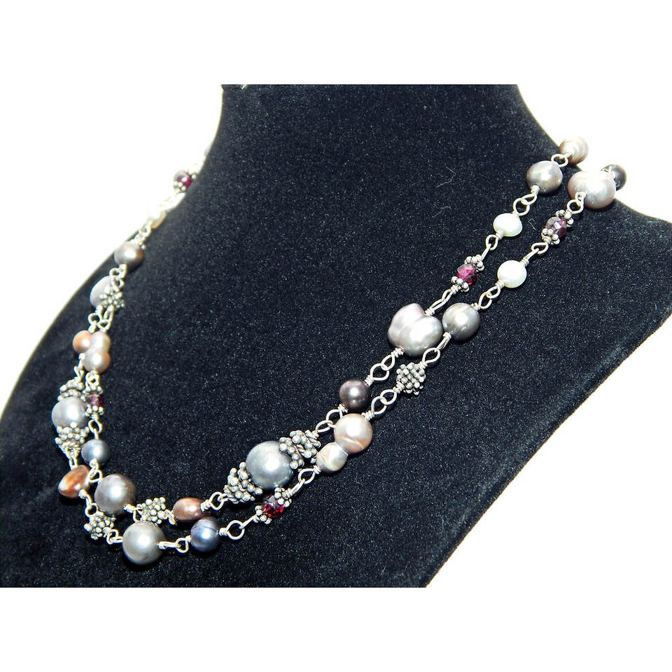 Collana Vintage a doppio filo. 925 in argento Sterling con perla e granato stile classico