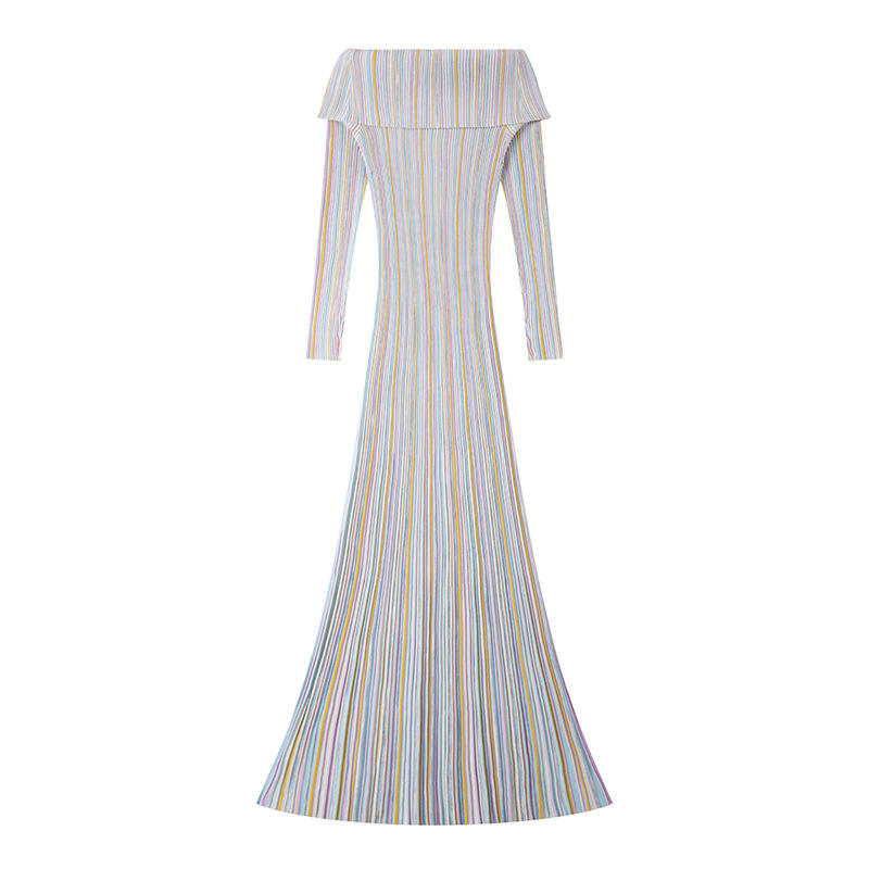 Vintage Elegant Style Lady Autumn Boat Neck Off Shoulder Long Sleeve Women Knit Striped A-line Maxi Dress