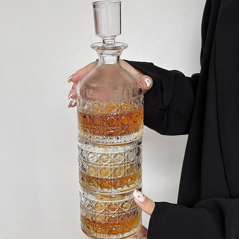 Nome del prodotto:Set di Decanter e Bicchieri da Vino in Cristallo Impilabili con Motivo Vintage in Rilievo