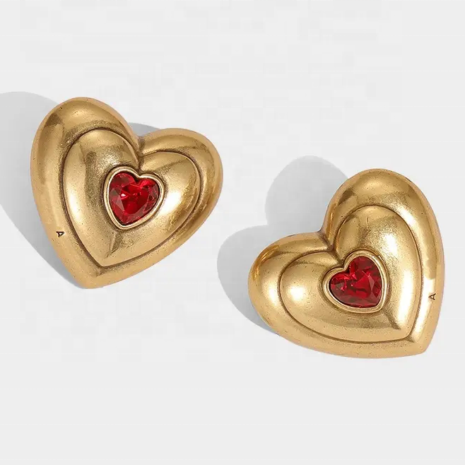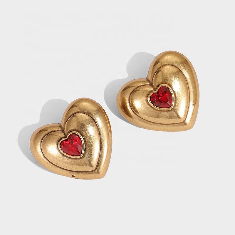 Vintage Exaggerated Personality Brass Gold Plated Old Love Red Peach Heart Earrings
