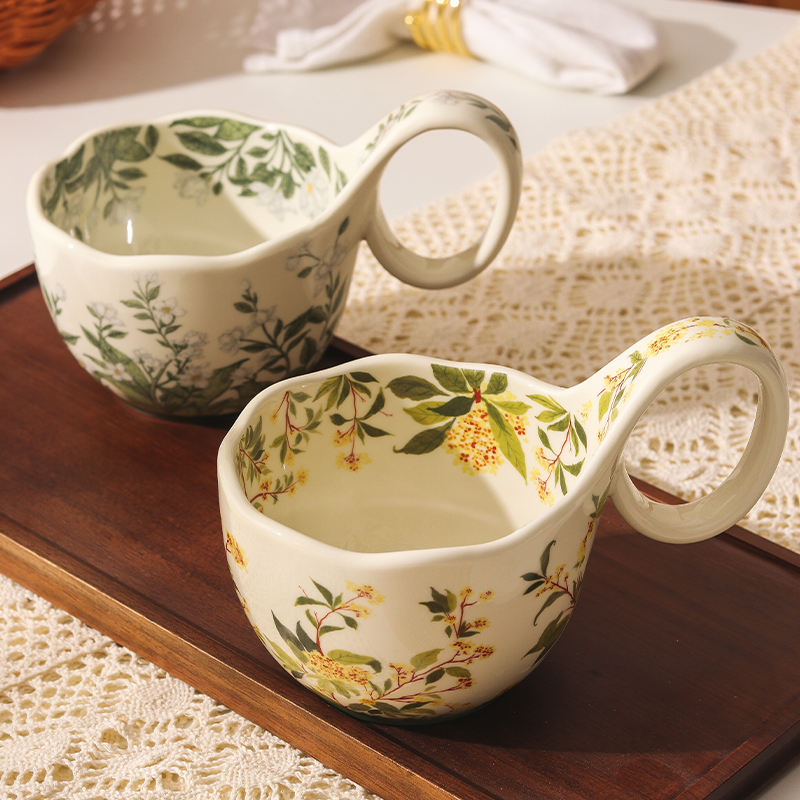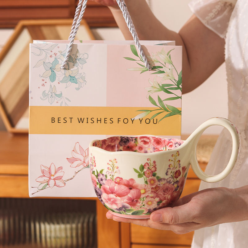 Tazza in ceramica Vintage in broccato floreale con manico a cucchiaio 10 once ciotola di farina d'avena per la colazione a casa lavabile in lavastoviglie per il tè del pomeriggio