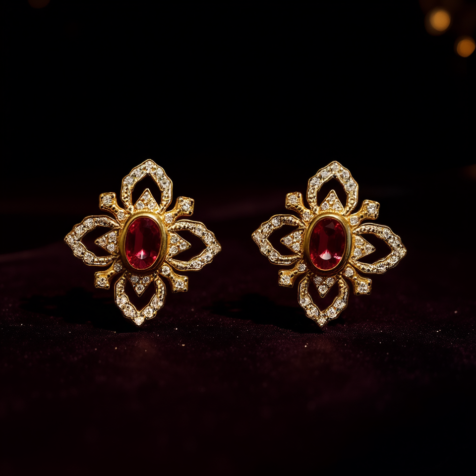 Vintage Gold Plated Ruby Stud Earrings Flower Design Bezel Setting Women's Party Jewelry Alloy Fashion Earrings