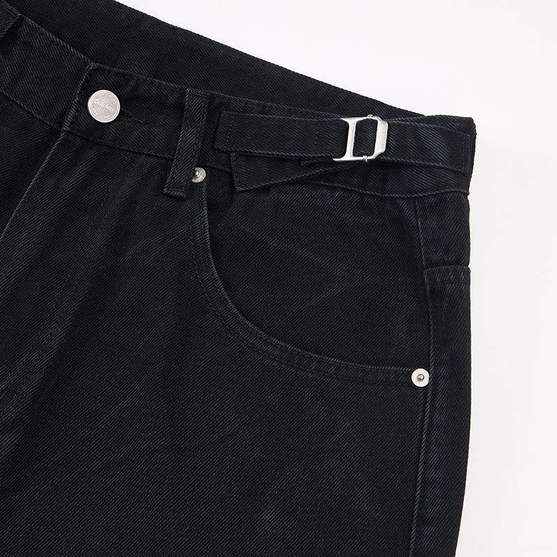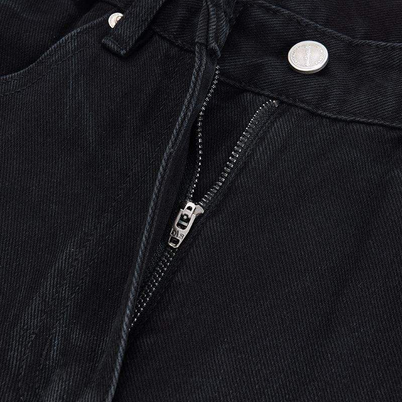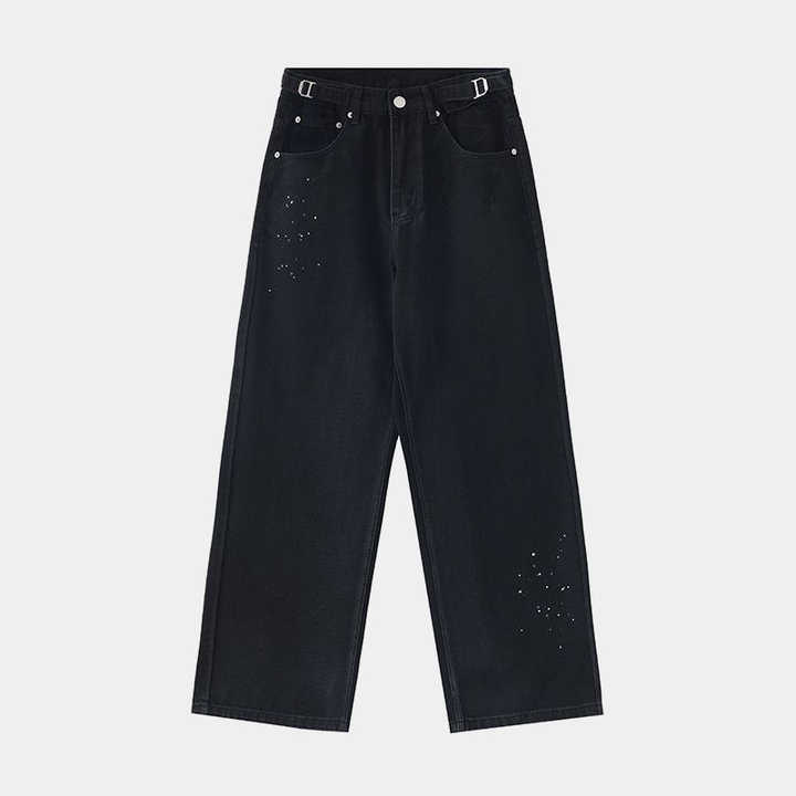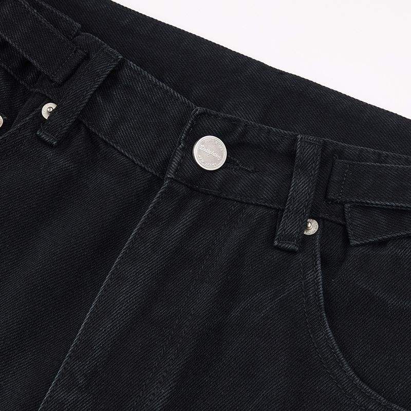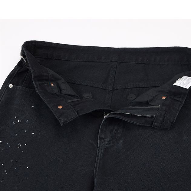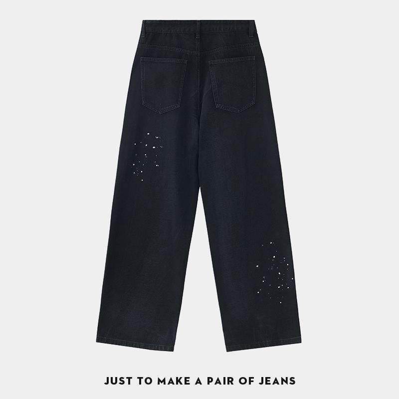 Design Vintage con Pittura a Inchiostro che Disturba il Comfort dei Jeans Larghi. Jeans Neri Usurati e Strappati.