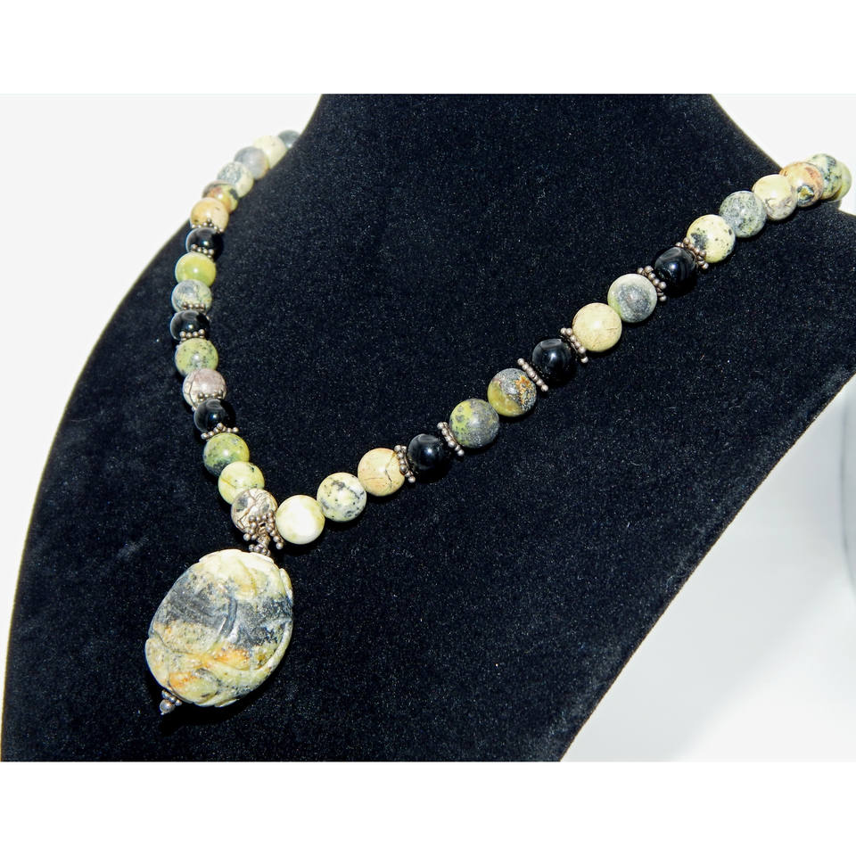 Vintage Jasper, onice nero e Serpentine in pietra con asiatico ciondolo intagliato