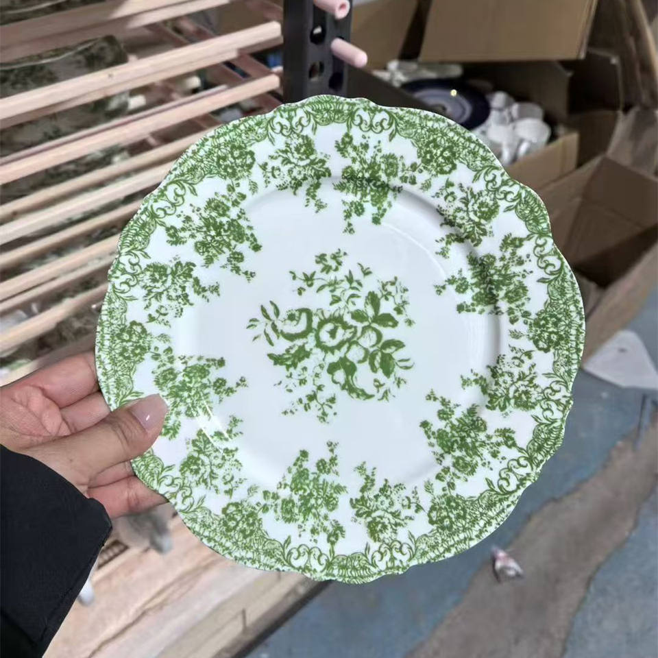 Set di stoviglie rotonde in porcellana con motivo Vintage in pizzo nuovo Set di piatti e piatti floreali blu verde