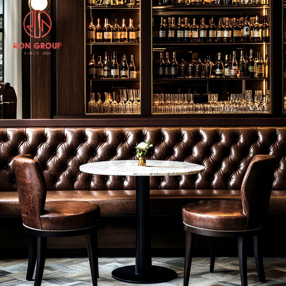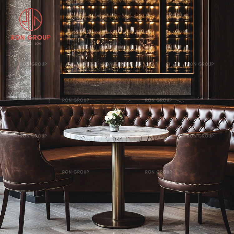 Vintage Luxury Furniture Set Leather Booth Seating Round Marble Table Upholstered Chair Restaurant Bistro Hotel Bar Cafe