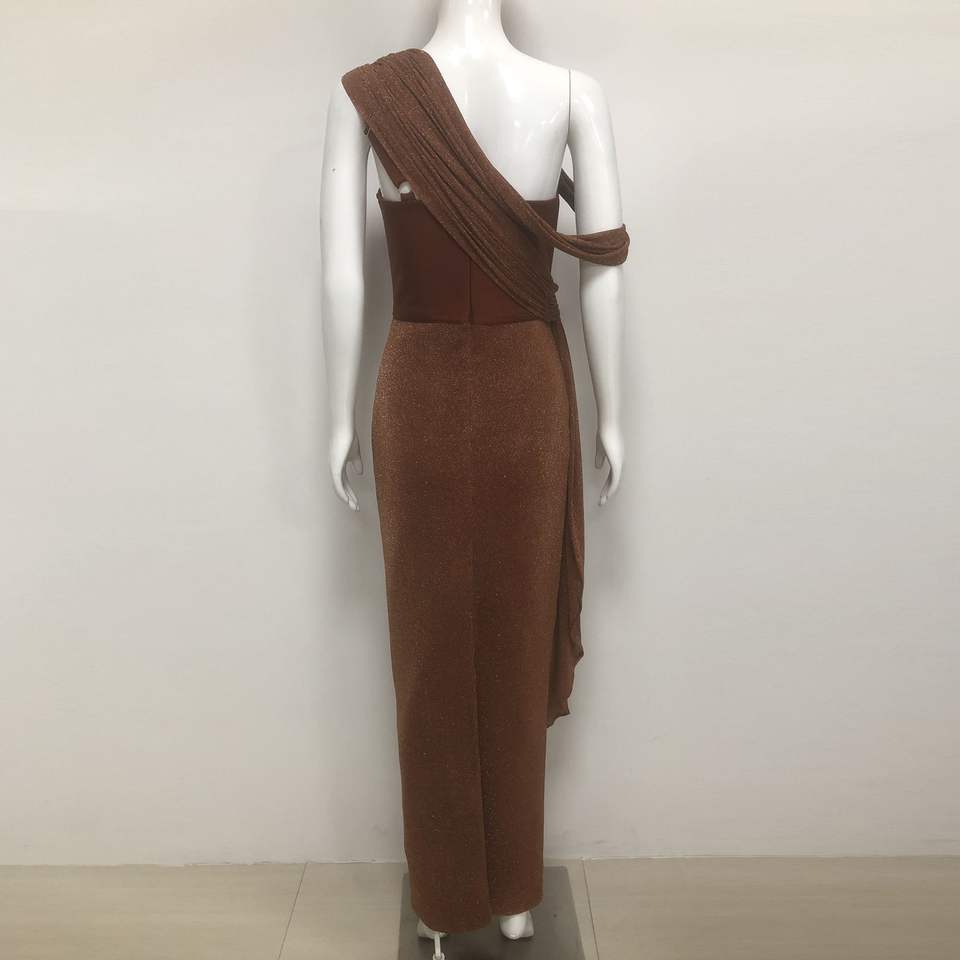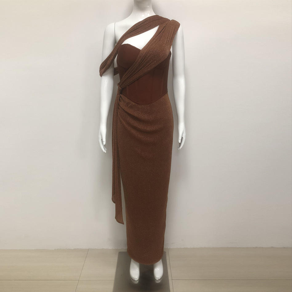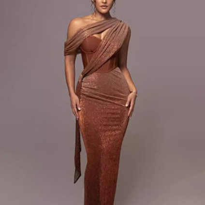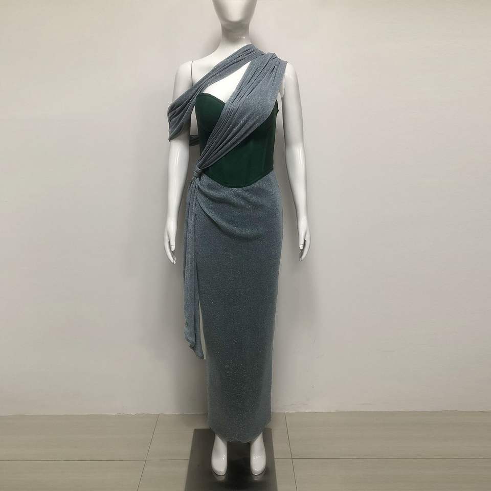 Abito lungo vintage monospalla da donna, elegante in tulle, da sera, con vita asimmetrica e nappe
