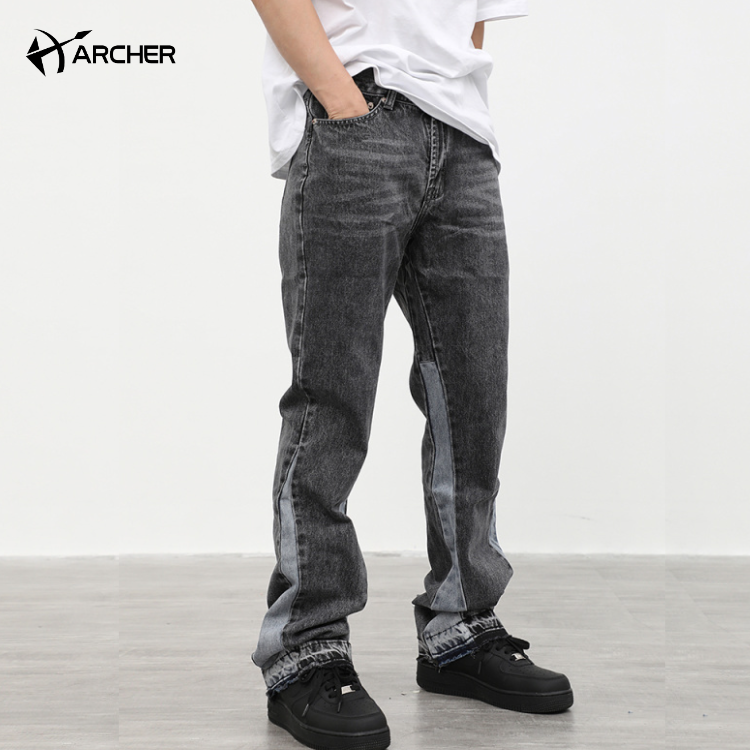 Vintage Patchwork Flare Jeans Urban Men Streetwear Wide Leg Denim Pant Hip Hop Black Colorblock Slim Fit Denim Jeans for Men