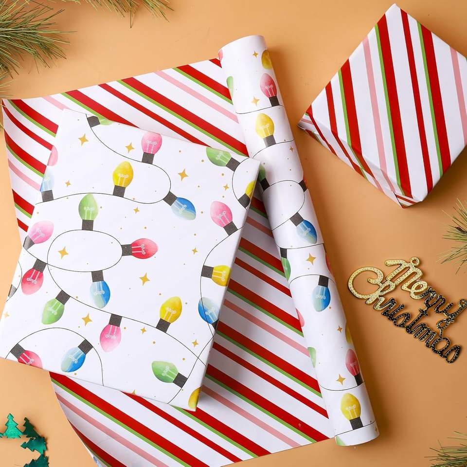 Rotolo di Carta da Regalo Natalizia Vintage Reversibile con Classiche Strisce Chiare per Feste e Celebrazioni Natalizie
