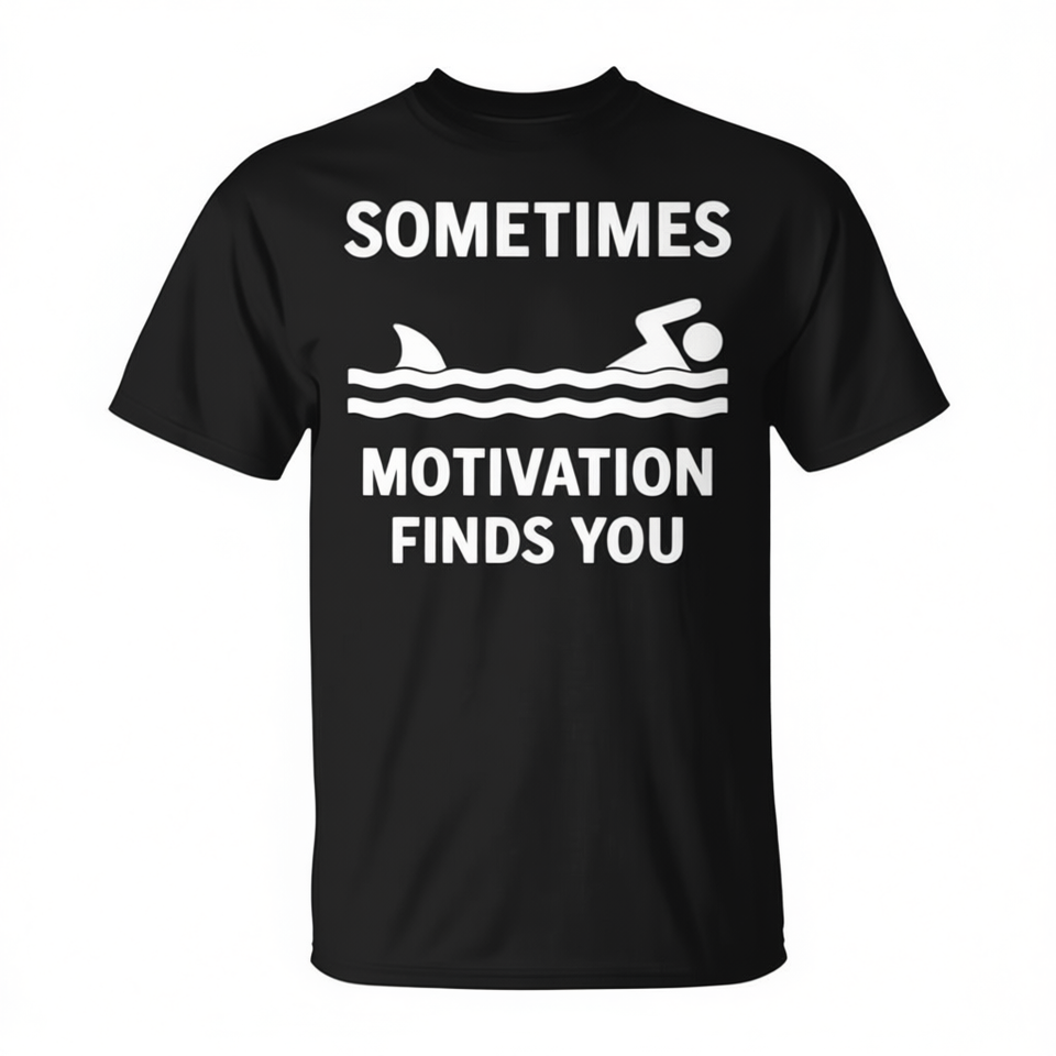 T-shirt vintage con stampa 'Sometimes Motivation Finds You Shark', design promozionale ispirato al vintage