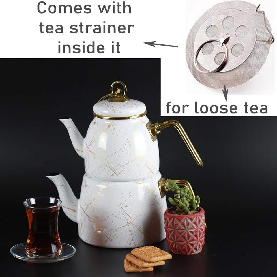 Vintage Turkish Tea Set with Enamel Kettle Infuser Party Cups & Glasses Floral Design China Origin (White-Gold)