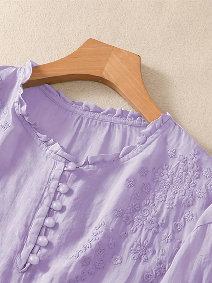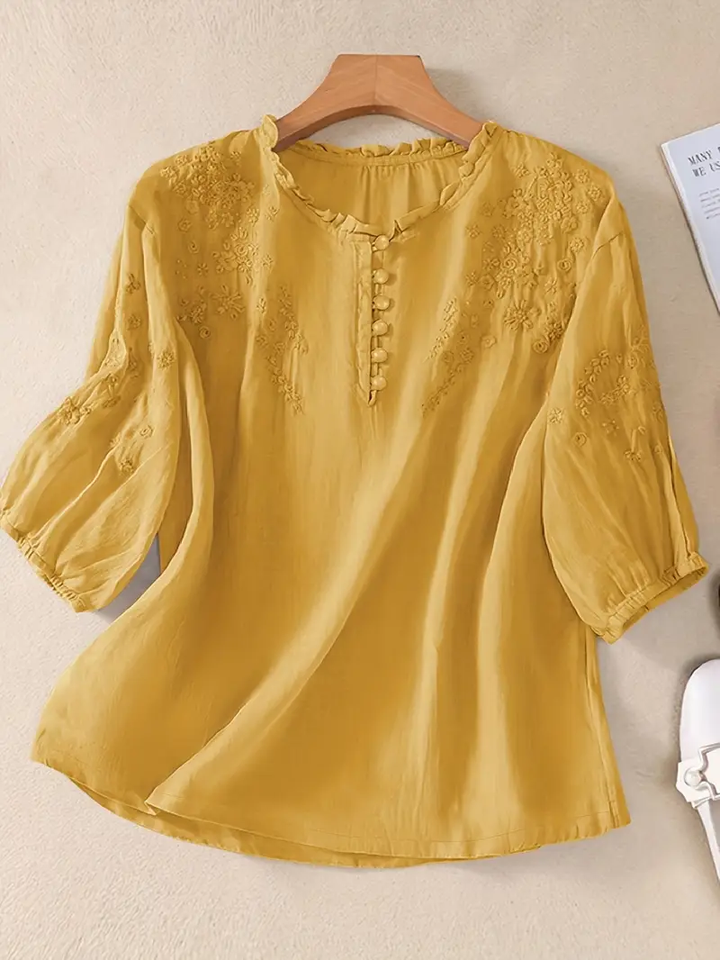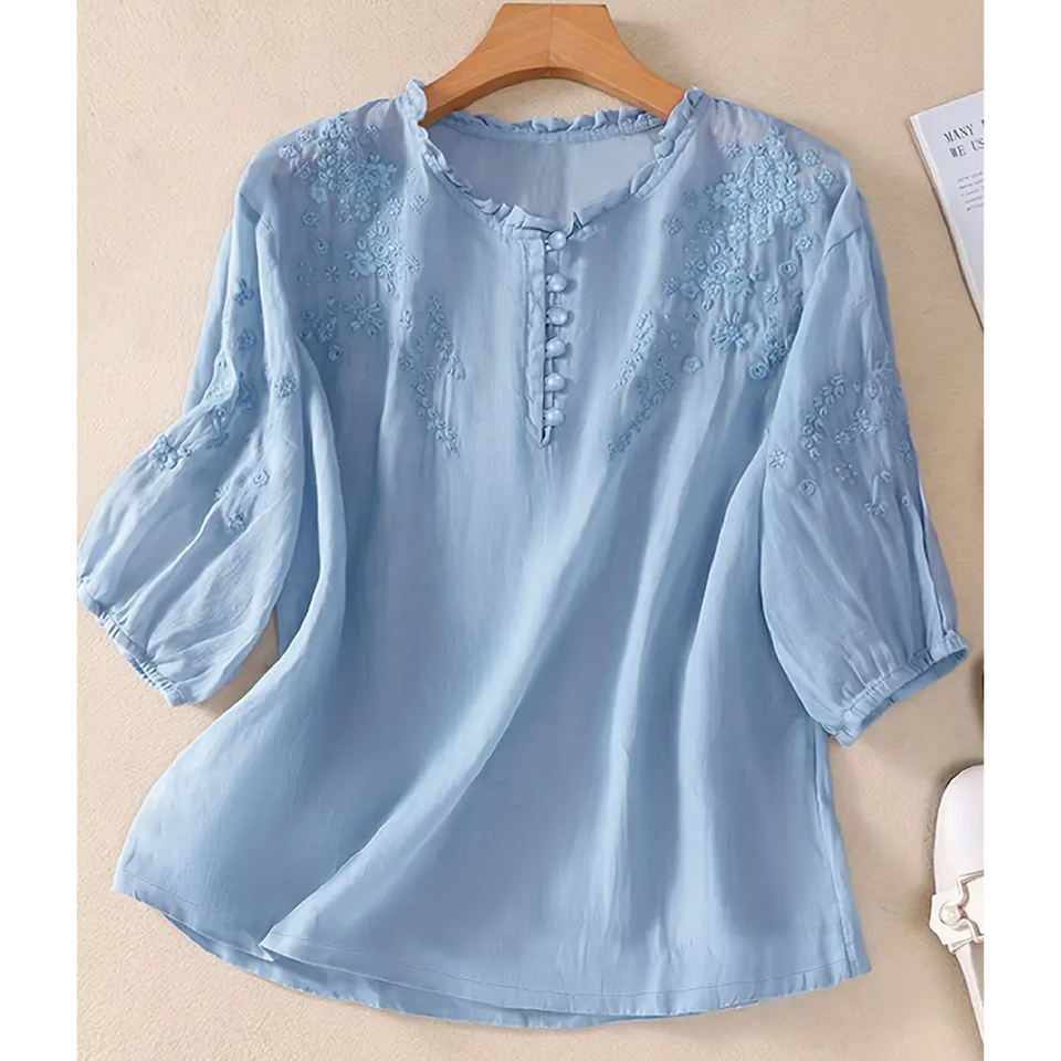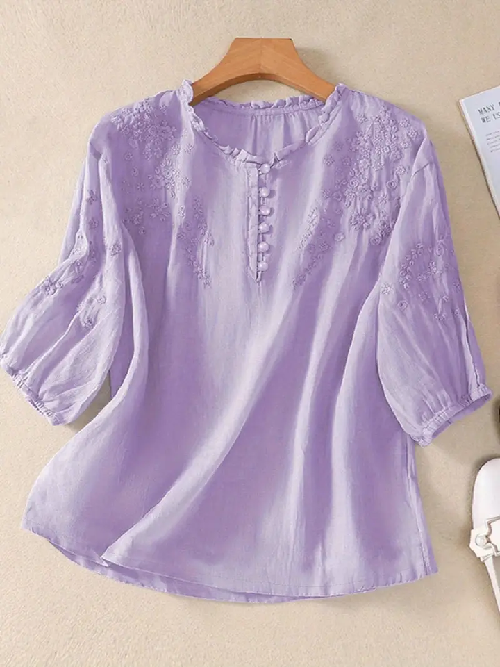 Vintage Women's Floral Embroidery Solid Half Sleeve T-Shirt New Loose Casual Tops Breathable Shirts for Women