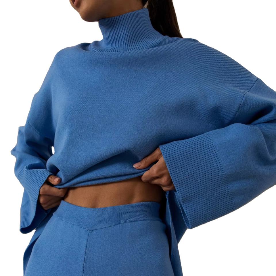 Vintage Women's Knitted Pants Sets Solid Pattern Wide Leg Pants Suits Irregular Sweater Pullover Casual Outfits for Autumn