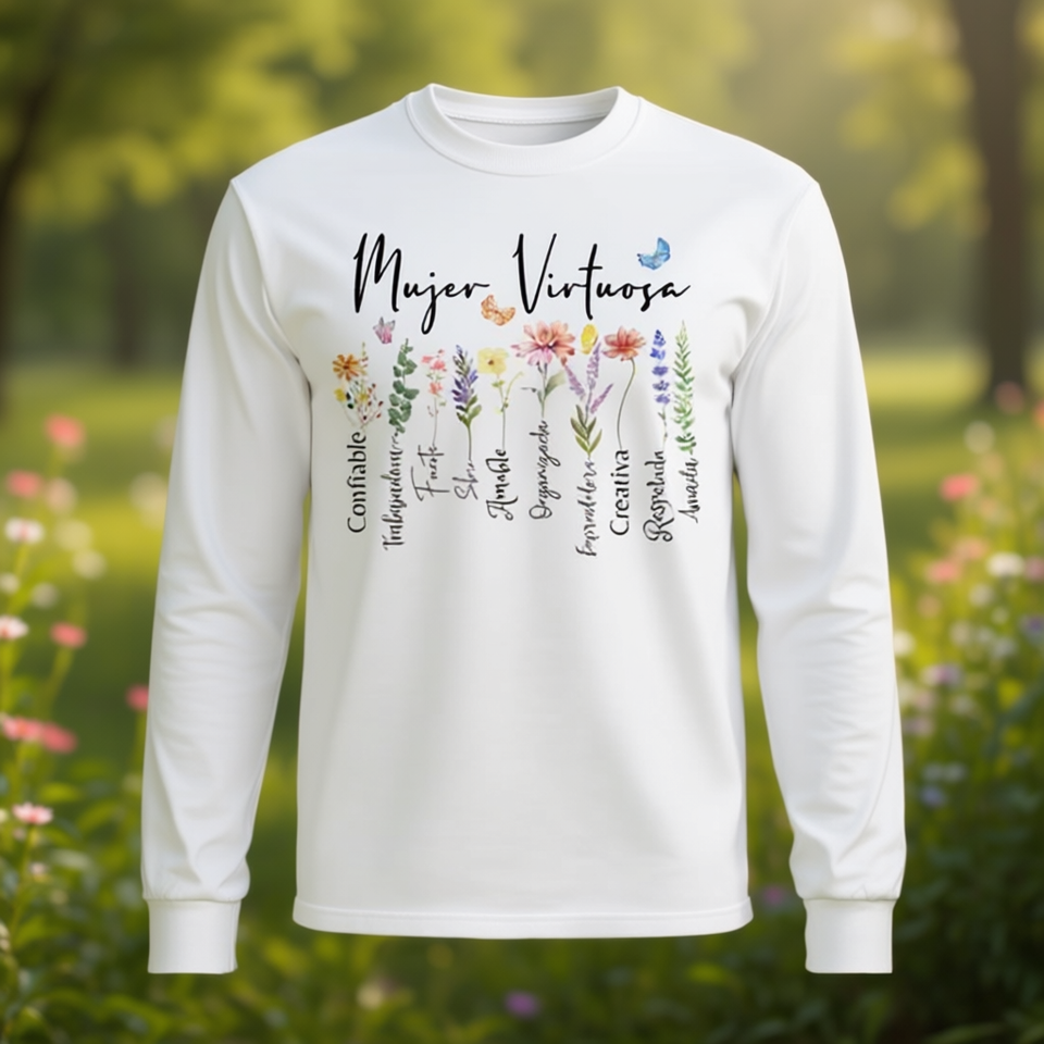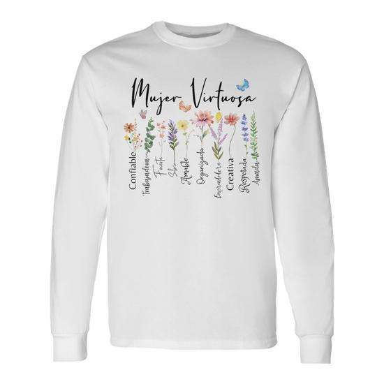 T-shirt a maniche lunghe girocollo con stampa digitale, design ispirato alla fede, con frasi religiose spagnole sulla virtuosa donna, per adulti, Cina