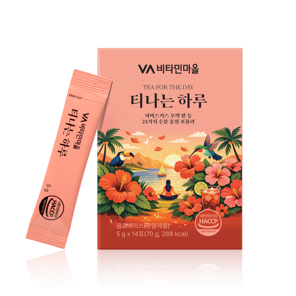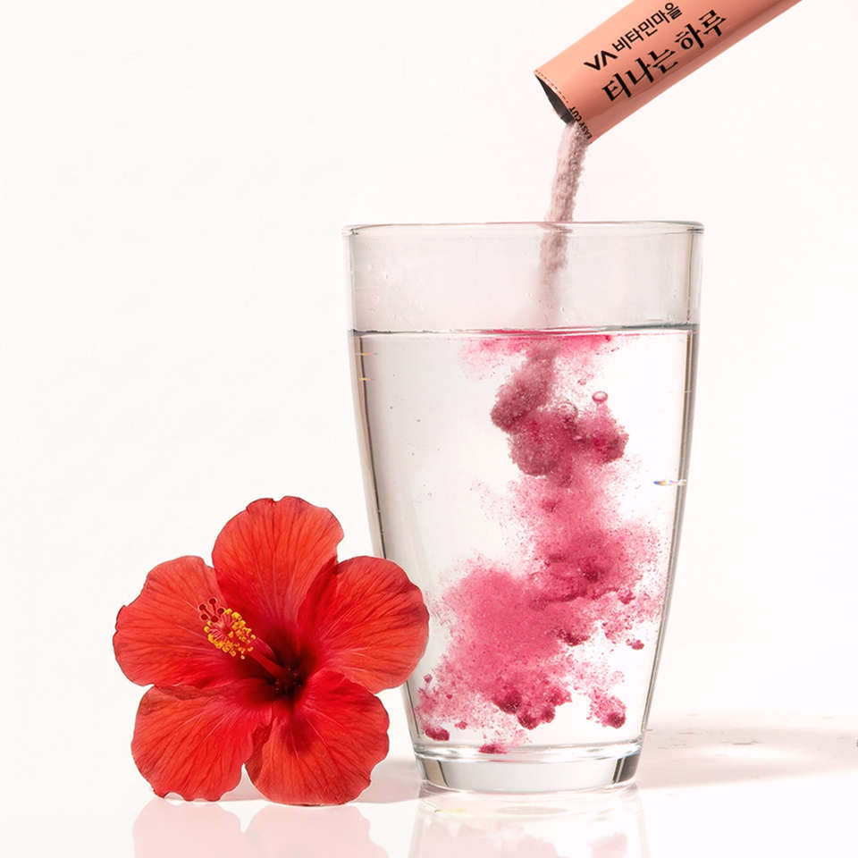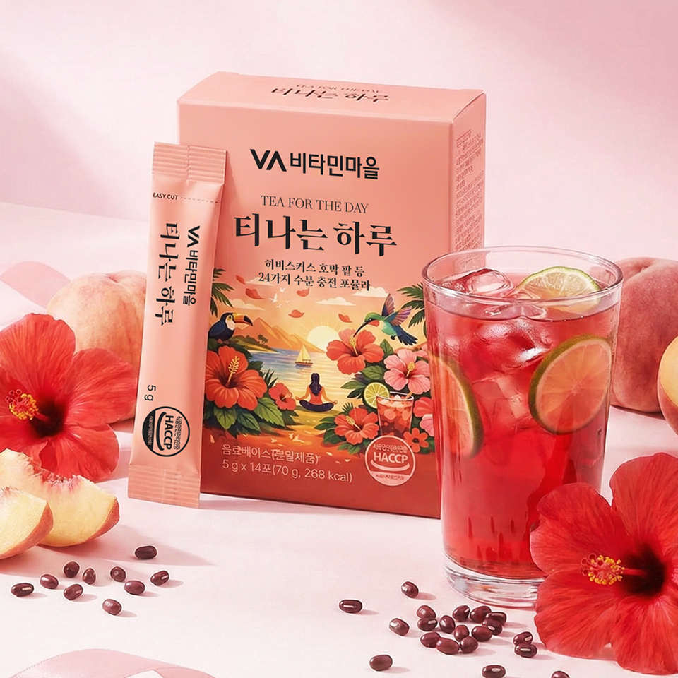 Vitamin Village Tè Coreano in Polvere ai Fiori, Tè Salutare Senza Zucchero, Miscela di Ibisco e Sambuco Ricca di Vitamina C, 5g X14 Bustine in Scatola