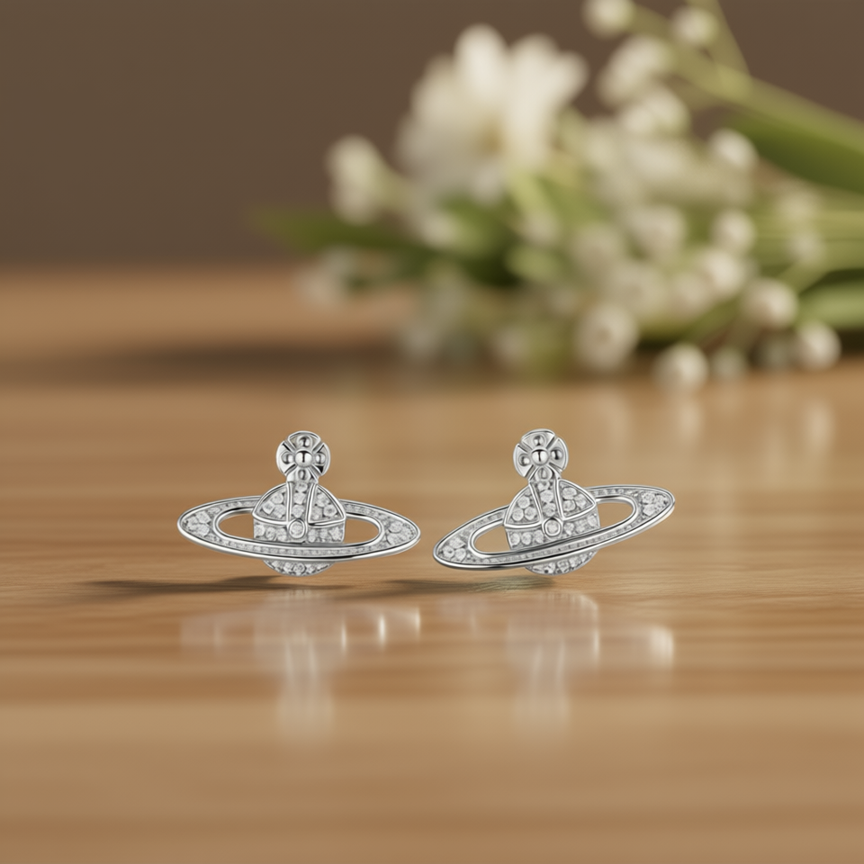 Vivienne Westwood Saturn Stud Earrings White Gold Pave Setting Crystal Rhinestone Women's Trendy Fashion Jewelry