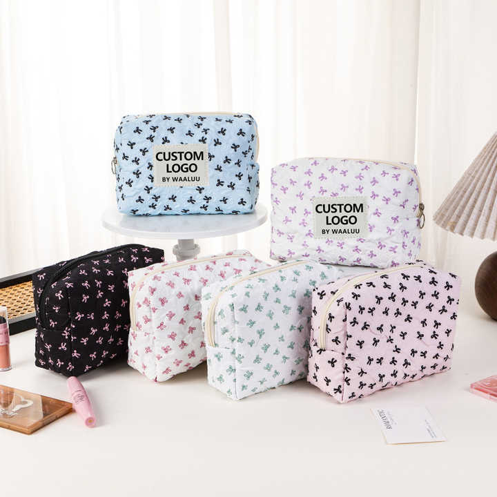 Borsa per il trucco da donna con motivo a fiocco floreale e gonfio wahuu con cerniera in stile caramella con cerniera custodia cosmetica con Logo rosa Make up Bag personalizzata