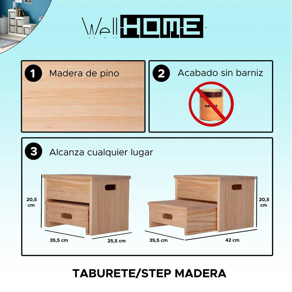 WELL HOME 2-Step Unvarnished Finish Step Stool 35x25x20 cm for Home or Office Use
