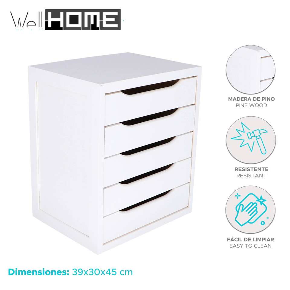 WELL HOME 5-Drawer White Dresser 39x30x45cm Chest with 39x30x45cm Storage Space
