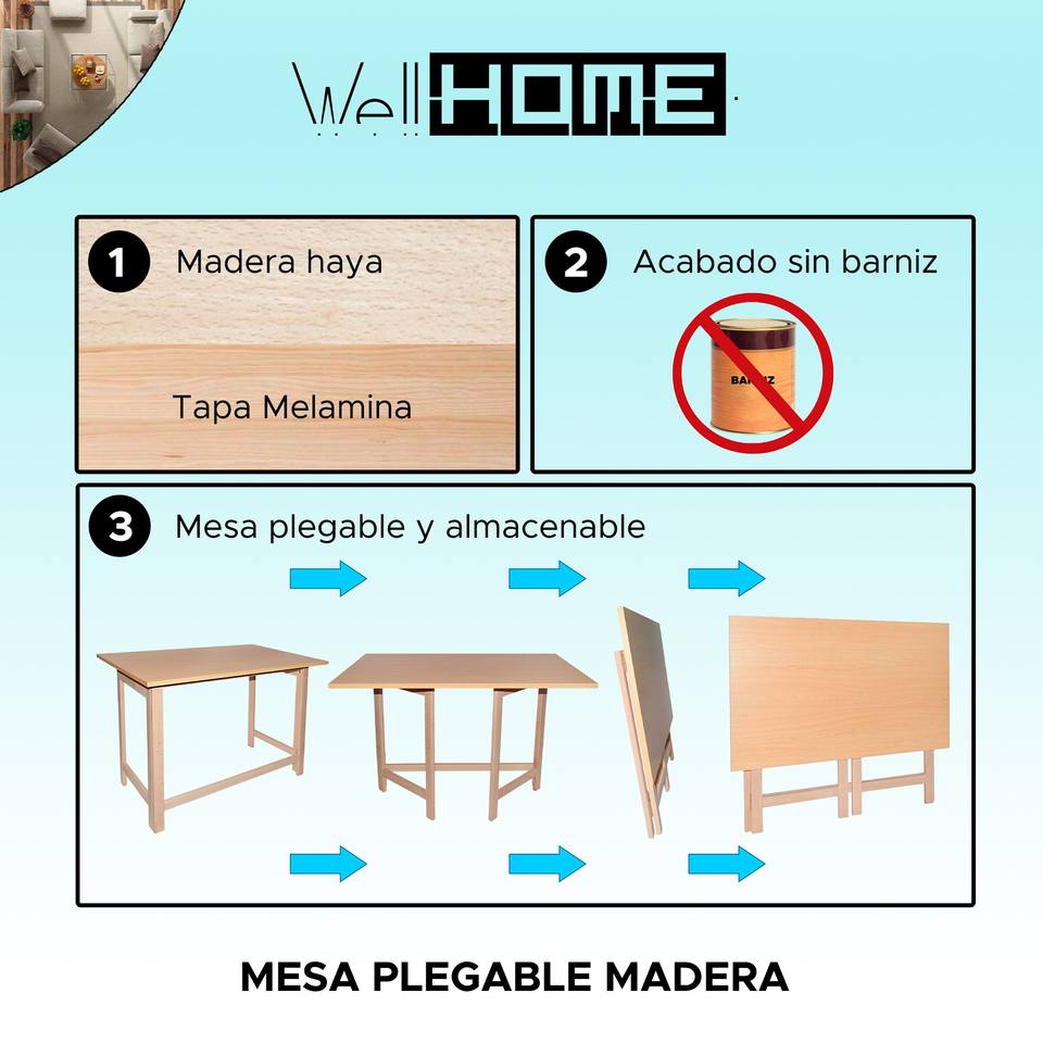 WELL HOME Folding Wooden Dining Table Top Unvarnished Finish Size L.100xF.60x75