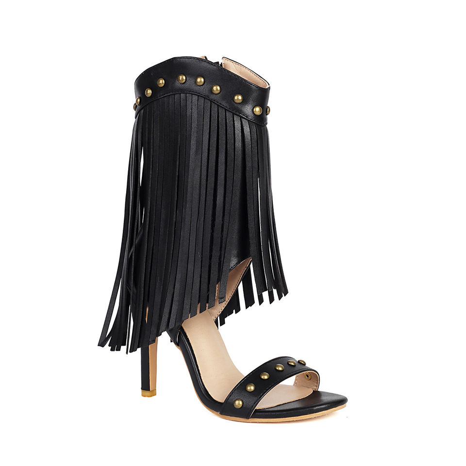WETKISS Sandali Gladiatore Vintage con Borchie e Frange per Donne, Punta Tonda, Tacco Alto a Spillo, Stivali con Nappine, Scarpe Estive da Festa