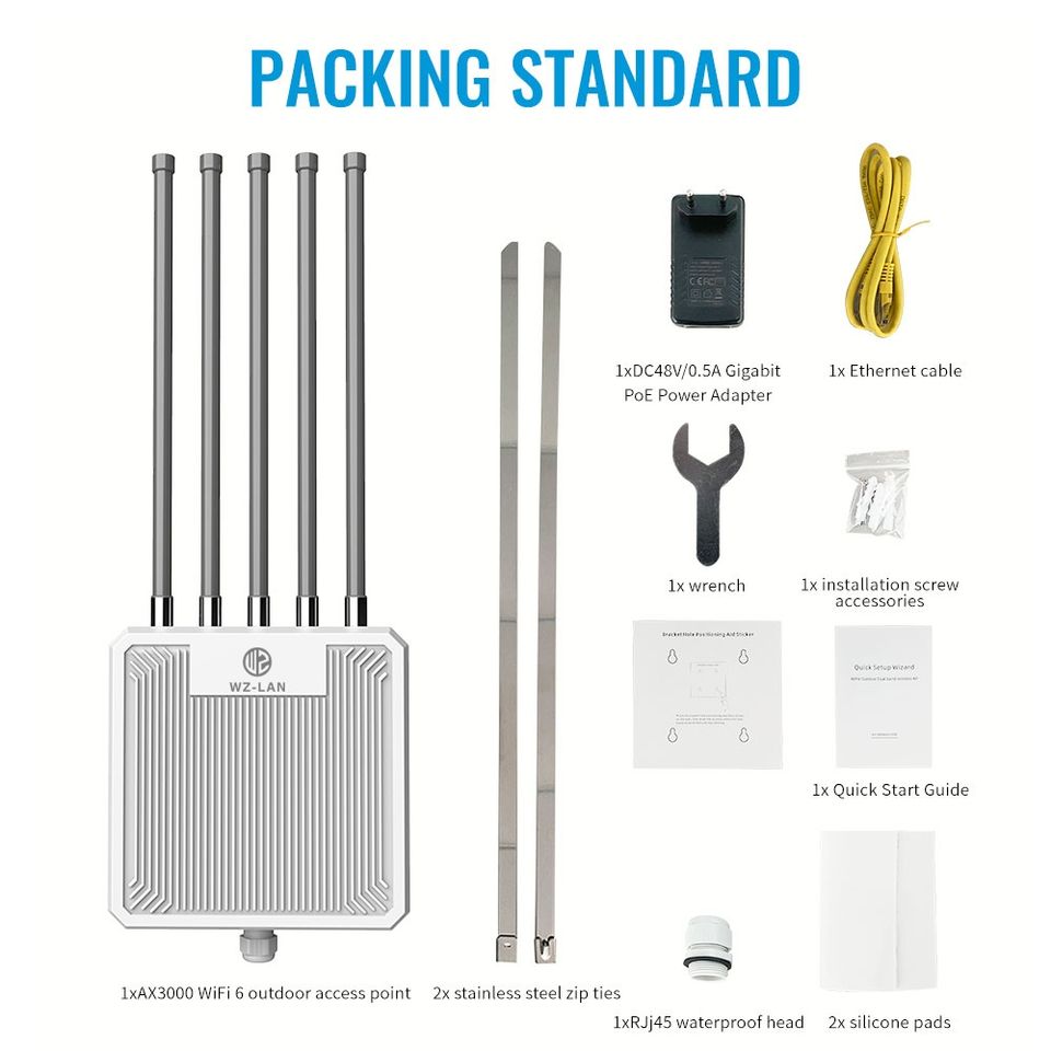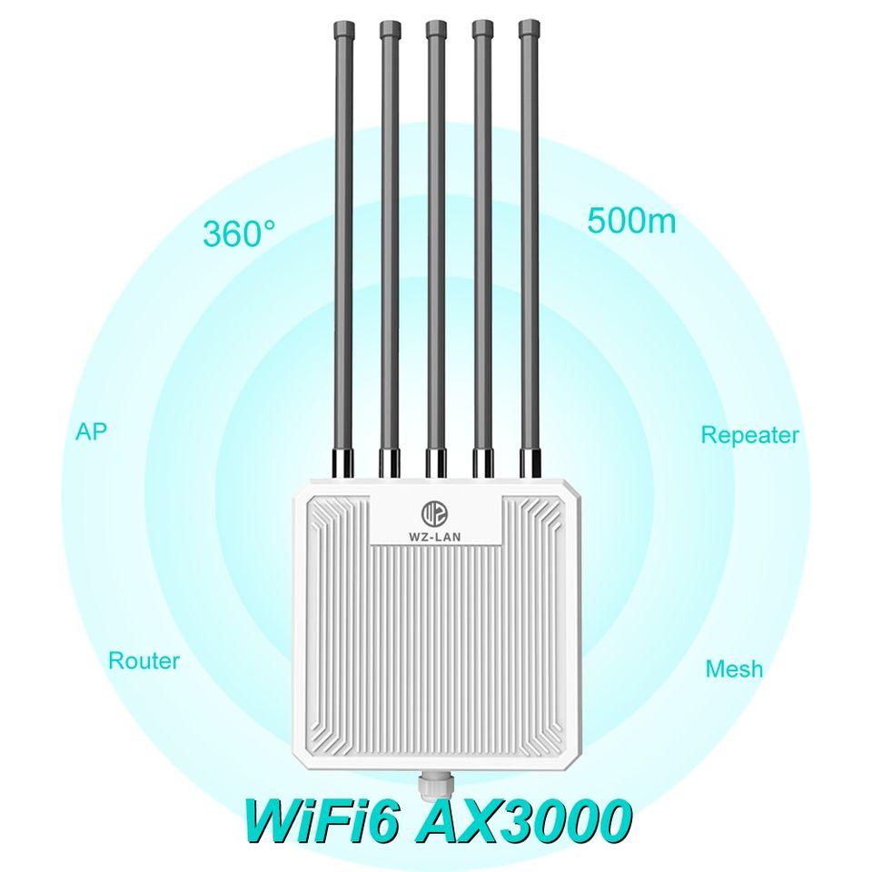 WZ-LAN WL388-AX3000 AP esterno Wi‑Fi 6 3000Mbps (574+2402) con 5×8 dBi in fibra di vetro, IP67, PoE af/at, 15kV