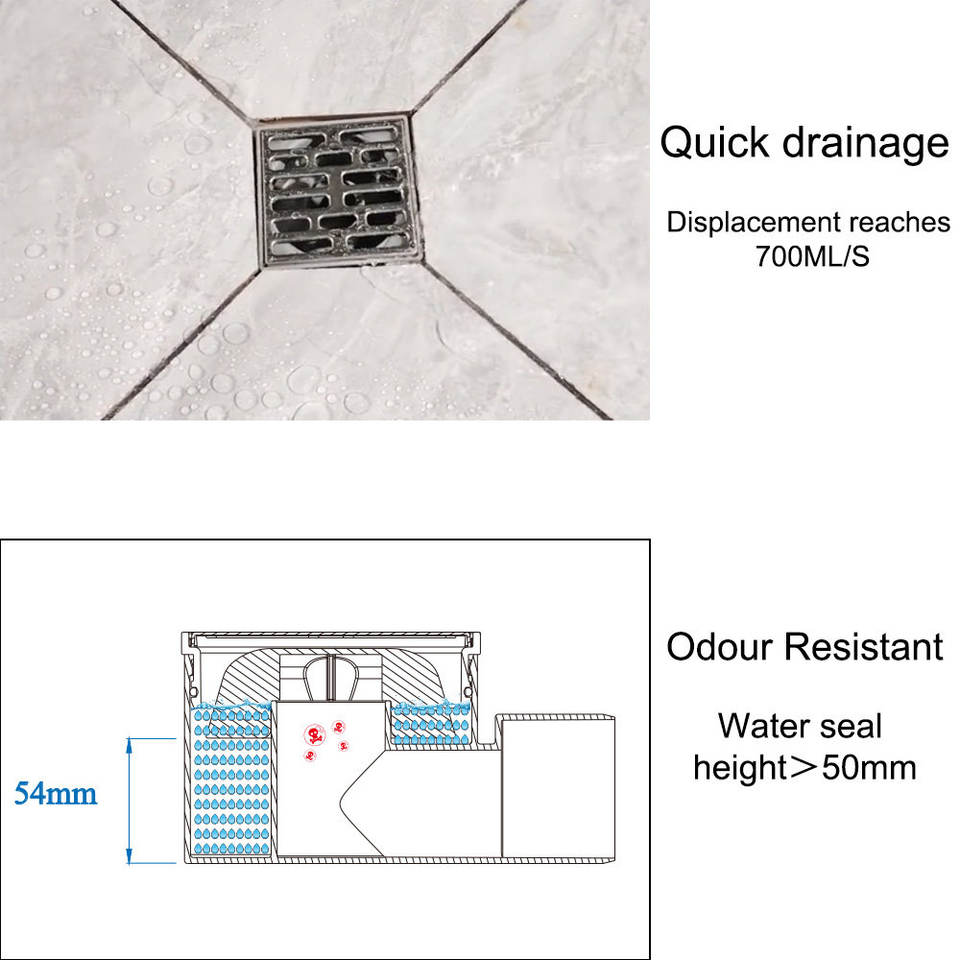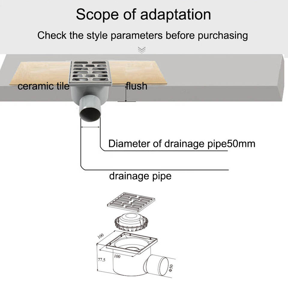 WaiiHO 033 Scarico a pavimento quadrato moderno in acciaio inossidabile 304, finitura lucida elettroplaccata in PVC, coperchio rimovibile, resistente agli odori, installazione rapida