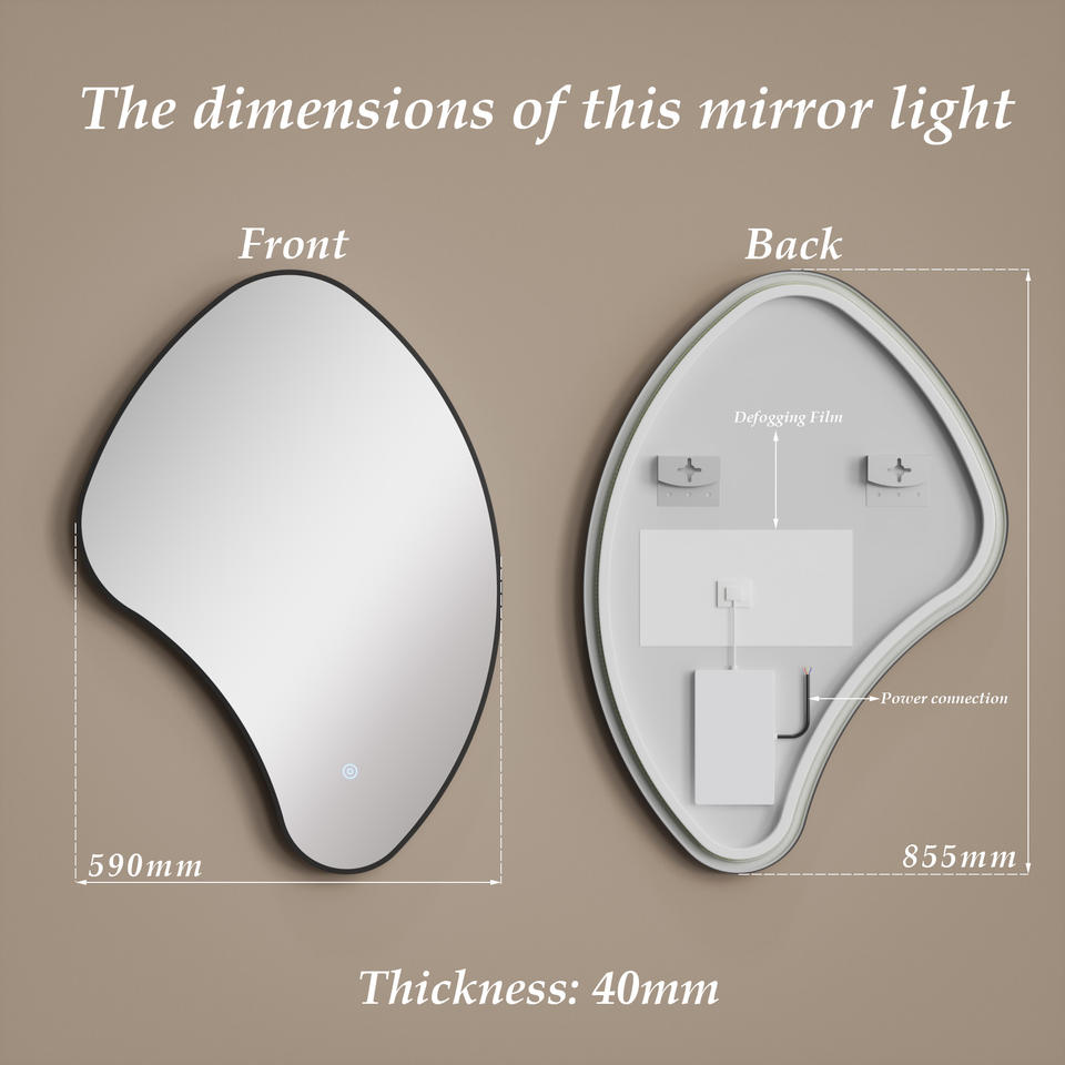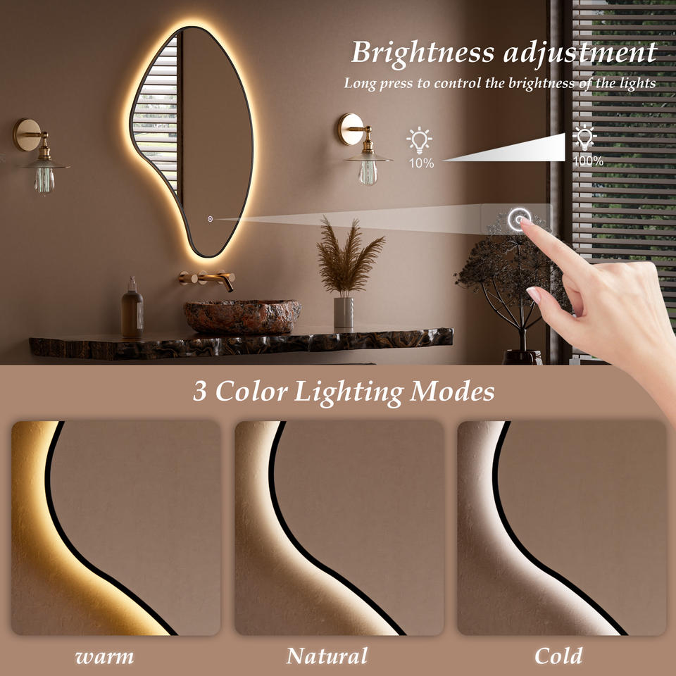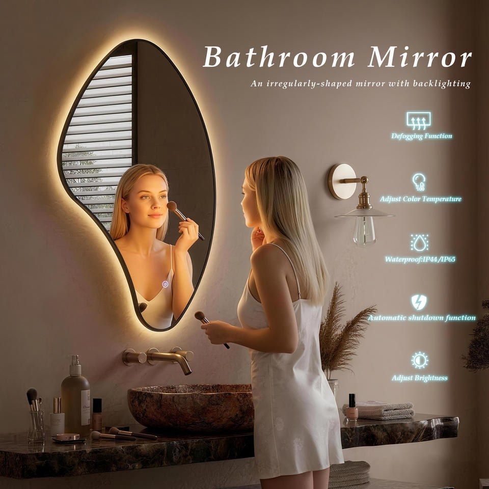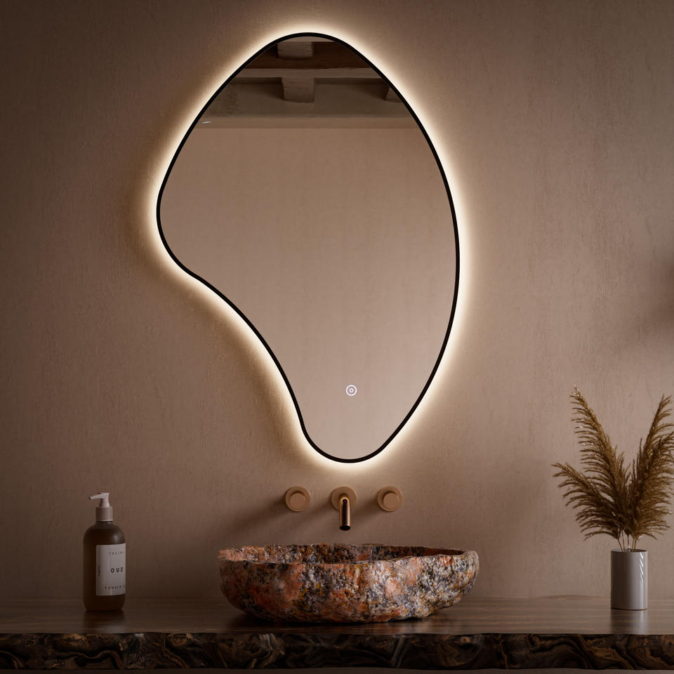 Specchio da Bagno da Parete Infrangibile con Cornice in Metallo Nero Irregolare Retroilluminato