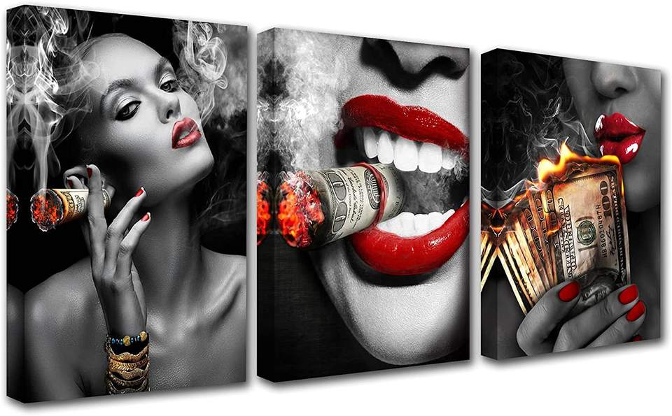 Wall Decorations for Living Room Hot Women Smoking Dollar Pictures Red Lips Burning Money Dollars Paintings 3 Panel Canvas Moder