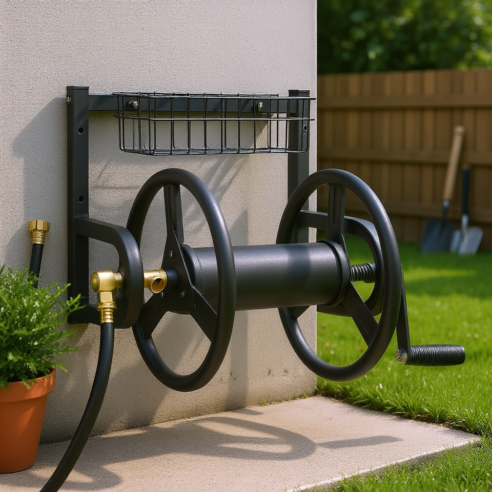 Avvolgitubo da Giardino 125 Piedi 5/8 Pollici Montabile a Parete con Raccordo in Ottone e Cesto per Irrigazione Giardino Tubo in PVC