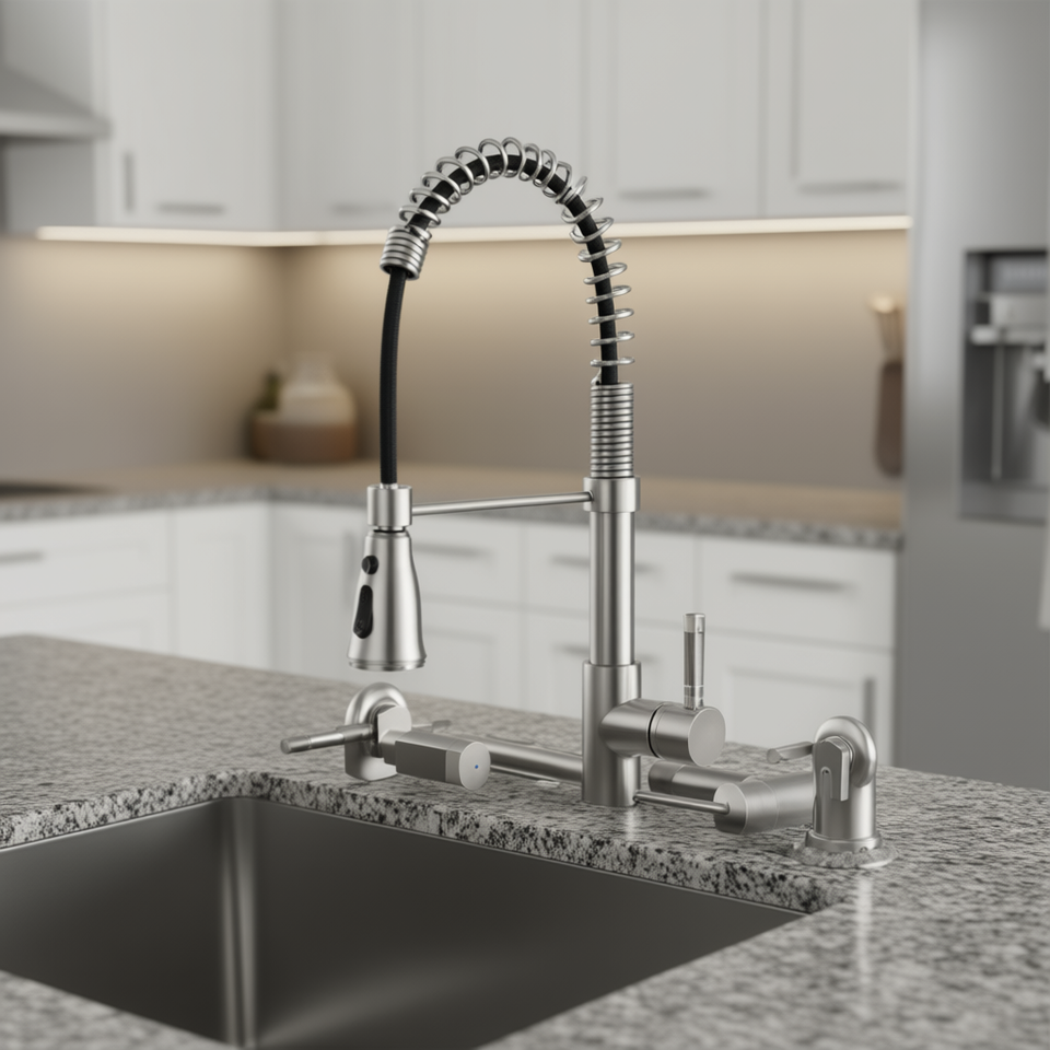 Rubinetto da Cucina a Parete con 3 Funzioni, Design a Ponte, Doccetta Estraibile, 2 Maniglie, Finitura Nichel Spazzolato, Stile Moderno per Cucine
