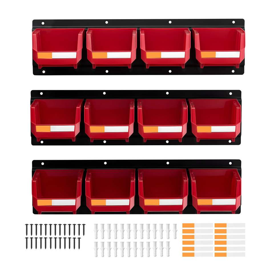 Contenitori di Plastica da Parete, 12 Unità con 3 Guide Metalliche, Contenitori Impilabili Sospesi con Viti, Dadi e Bulloni Inclusi