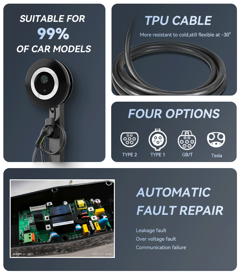 Wallbox Ev Charger for Tesla with Hook Type1 Type2 Gb/T Ip67 Waterproof Bluetooth Wifi Smart Control Circuit Breaker
